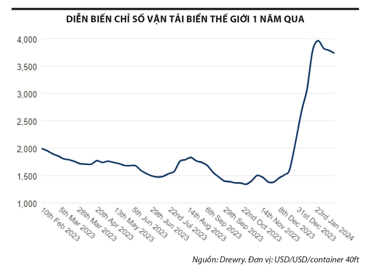 Với hành trình vận tải dài hơn, giá cước vận tải thế giới các tuyến chính đi qua kênh đào Suez và khu vực biển Đỏ đã tăng mạnh. Dữ liệu của Drewry từ ngày 30/11/2023 đến 25/1/2024 cho thấy, chỉ số World Container Index (chỉ báo 8 tuyến vận tải biển chính trên thế giới) tăng 187%, từ 1.382 USD/container 40ft lên 3.964 USD/container 40ft.