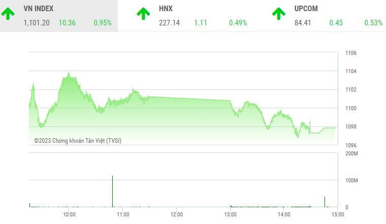 Chốt phiên, sàn HOSE có 201 mã tăng và 199 mã giảm, VN-Index tăng 6,98 điểm (+0,64%), lên 1.097,82 điểm. Tổng khối lượng giao dịch đạt 948,36 triệu đơn vị, giá trị 17.560,59 tỷ đồng, giảm 8,55% về khối lượng và 4,3% về giá trị so với phiên cuối tuần trước ngày 2/6. Giao dịch thỏa thuận đóng góp 54,39 triệu đơn vị, giá trị 1.244,7 tỷ đồng.