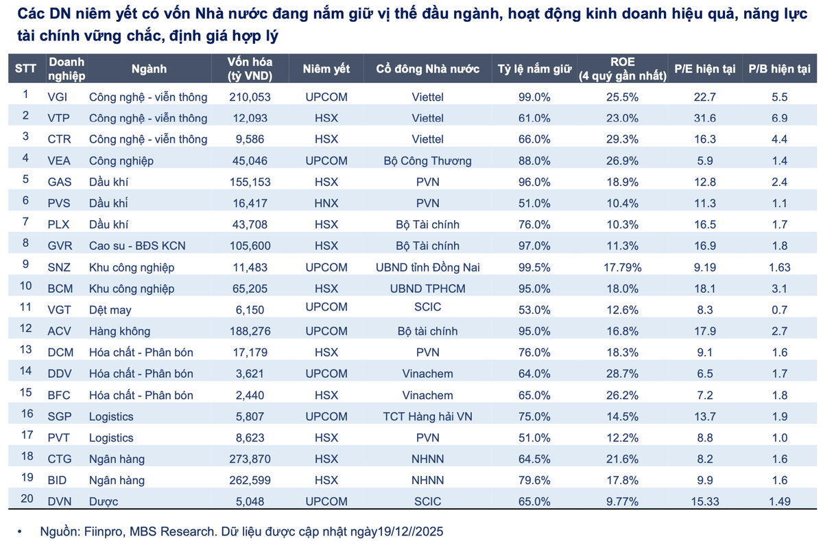 Tương tự như cú hích từ Nghị quyết 68 về kinh tế tư nhân, trong năm 2026, MBS kỳ vọng vào các doanh nghiệp niêm yết vốn Nhà nước là doanh nghiệp đầu ngành, có năng lực tài chính vững vàng (tiền mặt dồi dào), có hiệu quả hoạt động tốt (ROE% trên 10%) và định giá đang ở mức hấp dẫn.