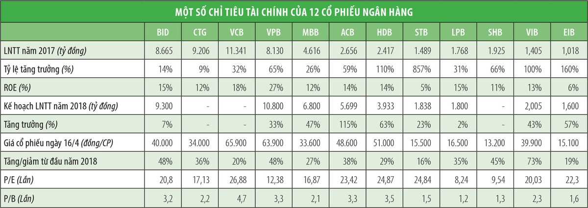 Thống kê 15 cổ phiếu ngân hàng đang giao dịch trên thị trường chứng khoán Việt Nam đến ngày 16/4/2018, bao gồm 4 ngân hàng đăng ký giao dịch trên sàn đại chúng chưa niêm yết (UPCoM), 3 ngân hàng niêm yết tại Sở GDCK Hà Nội (HNX) và 8 ngân hàng niêm yết tại Sở GDCK TP.HCM (HOSE) cho thấy, ngoại trừ cổ phiếu BAB của BAC A BANK (UPCoM) có thị giá giảm 8% so với đầu năm 2018, thì 14/15 mã cổ phiếu còn lại đều có thị giá tăng trưởng. Trong đó, 12 cổ phiếu đạt mức tăng giá cao hơn mức tăng 19,33% trong quý I/2018 của VN-Index.