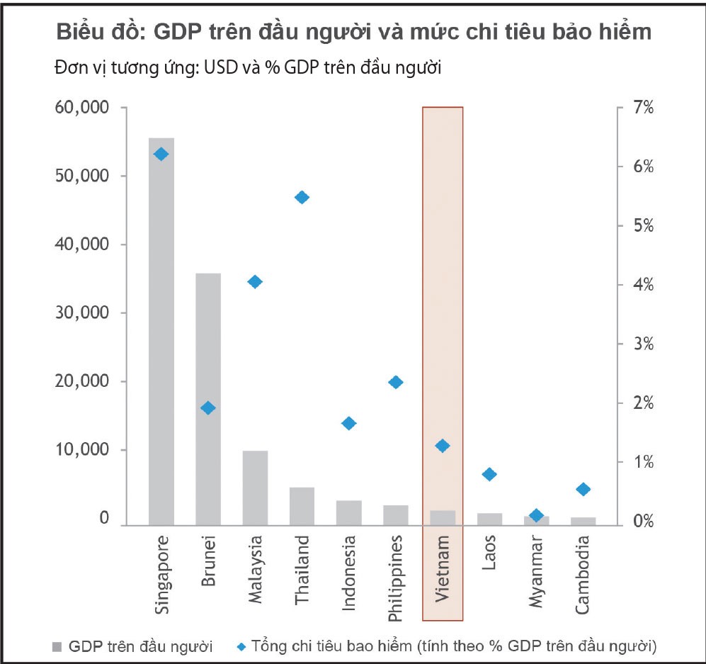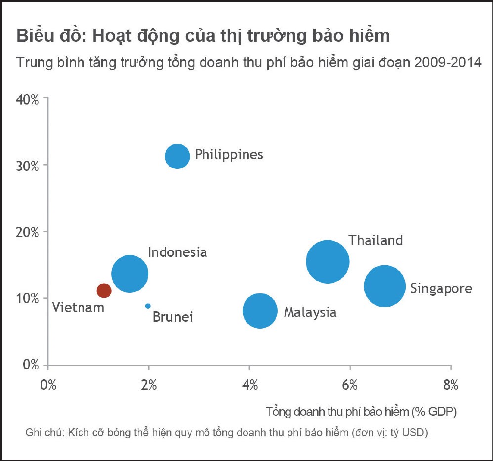 Nhìn từ góc độ khác, chỉ số tổng doanh thu phí bảo hiểm trên đầu người của Việt Nam trong giai đoạn 2005 - 2015 tăng ở mức khá cao là 378% (từ 9 USD năm 2005 lên 34 USD năm 2015). Tuy nhiên, mật độ bảo hiểm của Việt Nam ở nhóm thấp nhất trong khu vực, thấp hơn các nước có nền kinh tế trung bình như Philippines, Indonesia và cách khá xa Singapore (hiện khoảng 3.500 USD).