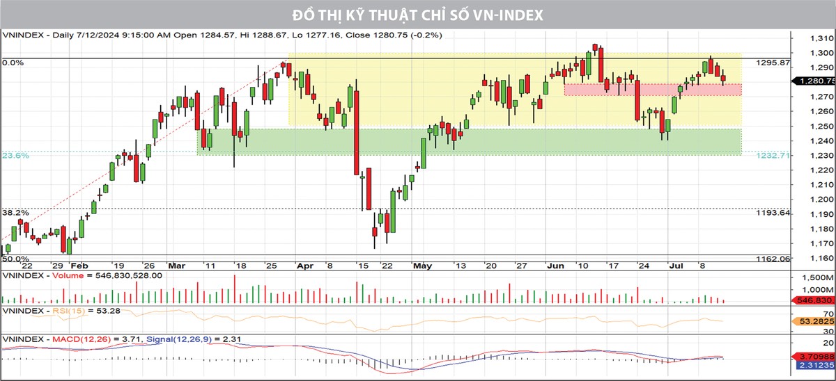 Sau một tuần hồi phục tích cực, tiến sát ngưỡng 1.300 điểm, VN-Index ghi nhận diễn biến chậm lại và điều chỉnh trong 3 phiên giao dịch cuối tuần qua. Khép lại tuần giao dịch, chỉ số đóng cửa ở mức 1.280,75 điểm, giảm 2,29 điểm so với cuối tuần liền trước. Diễn biến này xảy ra trong bối cảnh tuần vừa qua không có quá nhiều thông tin hỗ trợ và các nhà đầu tư đang chờ đợi báo cáo kết quả kinh doanh quý II của các doanh nghiệp sẽ được công bố trong nửa cuối tháng 7.