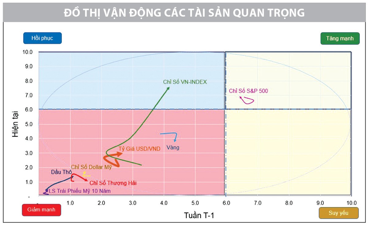 Nhìn trên bảng đồ thị vận động các tài sản, S&P 500 vẫn ở trong vùng Tăng mạnh, trong khi VN-Index đang cải thiện tích cực vị thế trong vùng Hồi phục, cho thấy lòng tin của nhà đầu tư vào thị trường vẫn còn. Nhờ vậy, dư địa tiếp tục tăng cho S&P 500 và VN-Index có thể được duy trì trong thời gian sắp tới. Tuy nhiên, trạng thái lưỡng lự với diễn biến giằng co mạnh trong phiên khi các nhà đầu tư có động thái chốt lời các khoản đầu tư có lãi của năm 2023 và trở nên cẩn trọng hơn khi đi tìm lý do tăng trưởng mới có thể sẽ tiếp tục được nhận thấy trong những phiên giao dịch tiếp theo.