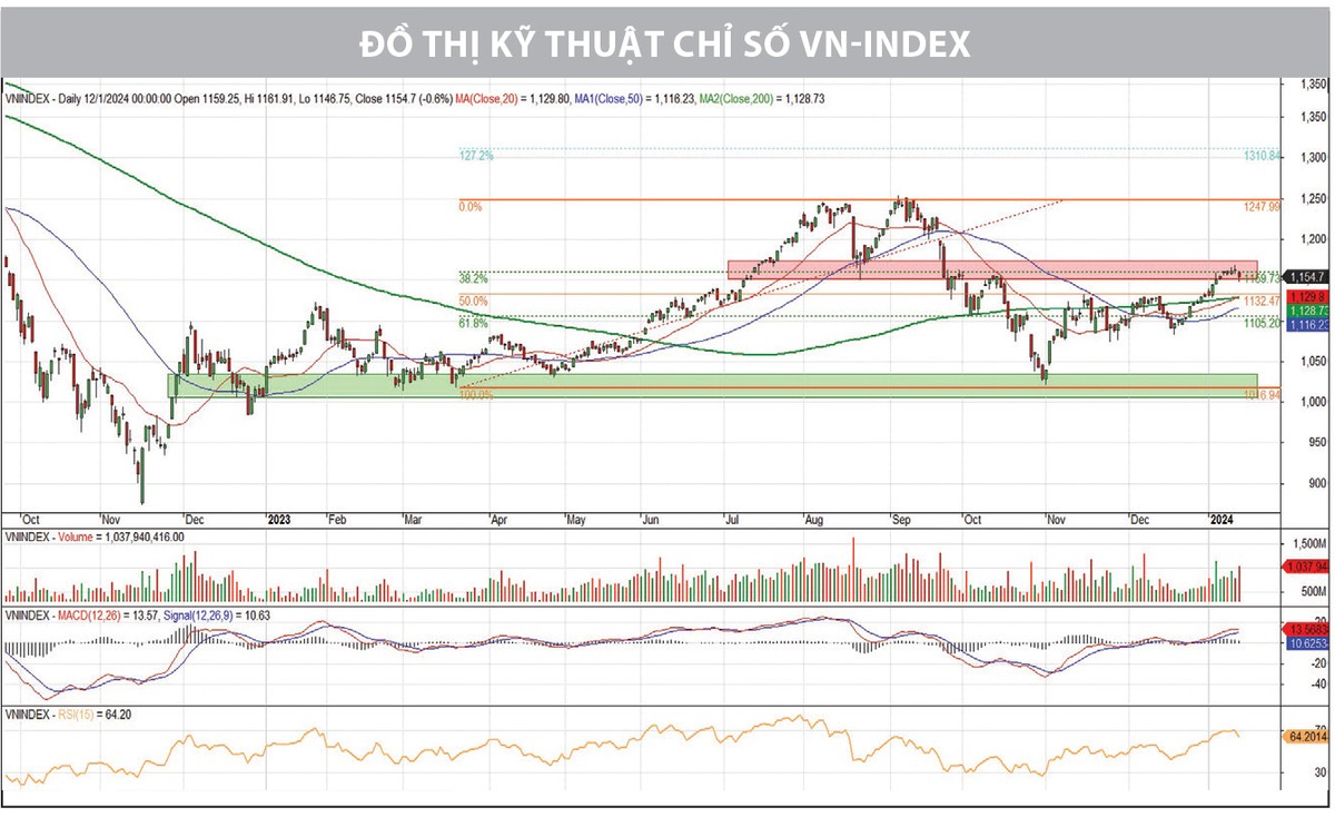 Sau khi bứt phá ra khỏi vùng giá hẹp 1.080 - 1.130 điểm trong tuần đầu tiên của năm 2024 và hình thành vùng giá mới, VN-Index trong tuần giao dịch vừa qua đã giữ được vùng giá này khi giao dịch giằng co trong vùng 1.150 - 1.170 điểm. Nhưng đây cũng chính là mức cản tiếp theo mà chỉ số phải đối mặt.