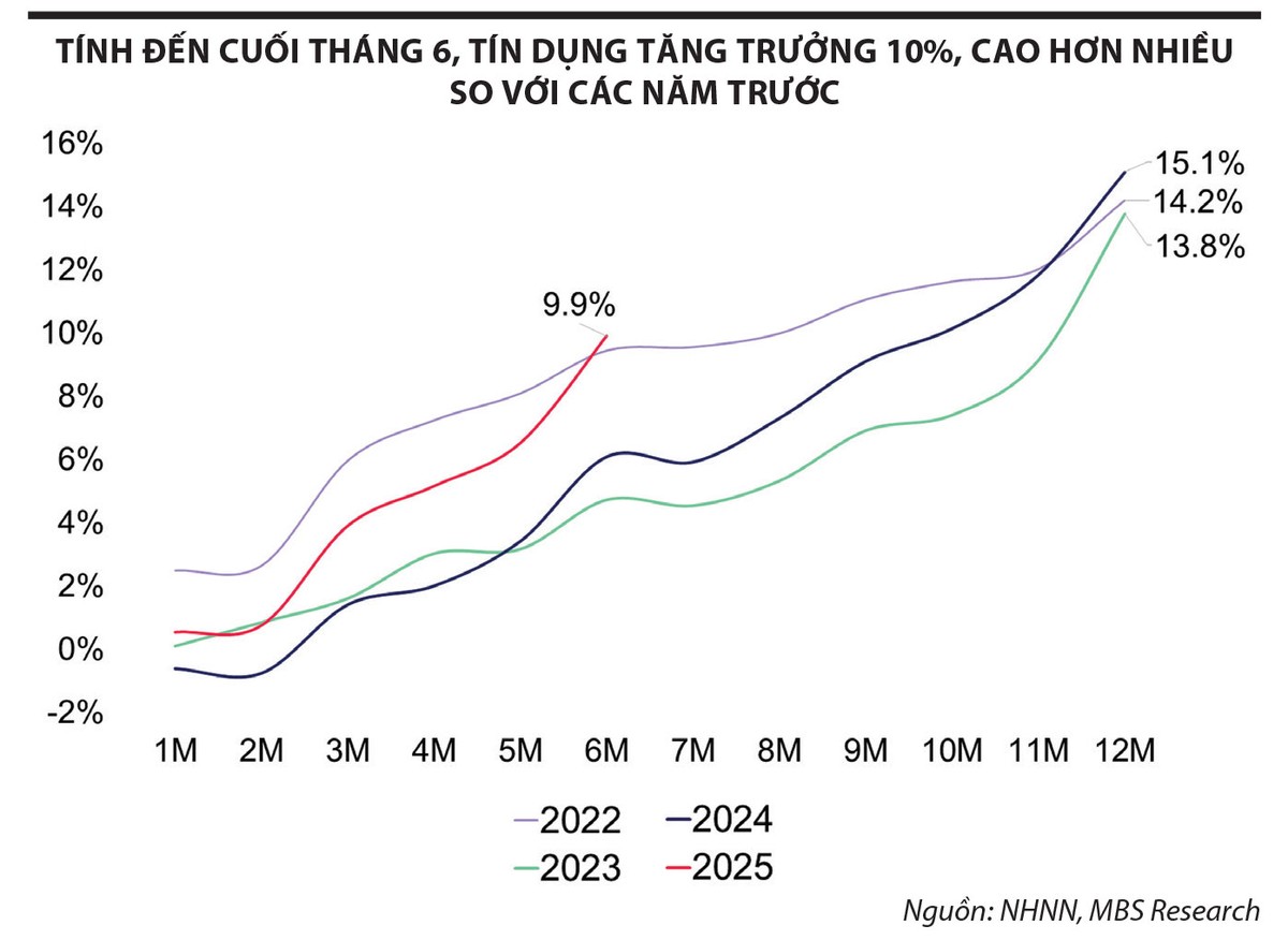 Ngoài ra, lĩnh vực bất động sản đang dần lấy lại đà phục hồi sau khi ba khung pháp lý quan trọng được áp dụng từ tháng 8/2024, giúp đơn giản hóa quy trình phê duyệt dự án và gia tăng nguồn cung. Nghị quyết 68 cũng góp phần gỡ bỏ các rào cản pháp lý và hành chính, đặc biệt đối với các dự án có giá trị kinh tế thực và dòng tiền bền vững. Mặt bằng lãi suất thấp tiếp tục giảm áp lực tài chính cho các chủ đầu tư, đồng thời kích thích nhu cầu vay mua nhà. Trong quý I/2025, tín dụng bất động sản đã tăng 7,49% so với đầu năm, vượt trội so với mức tăng 3,91% của tín dụng toàn hệ thống, cho thấy nhu cầu vốn cao trong lĩnh vực này. Các ngân hàng niêm yết có danh mục tín dụng đa dạng, bao gồm cả cho vay phát triển dự án và cho vay thế chấp bán lẻ, sẽ được hưởng lợi tốt hơn từ đà tăng tốc tín dụng, hỗ trợ tăng trưởng lợi nhuận mạnh mẽ trong nửa cuối 2025.