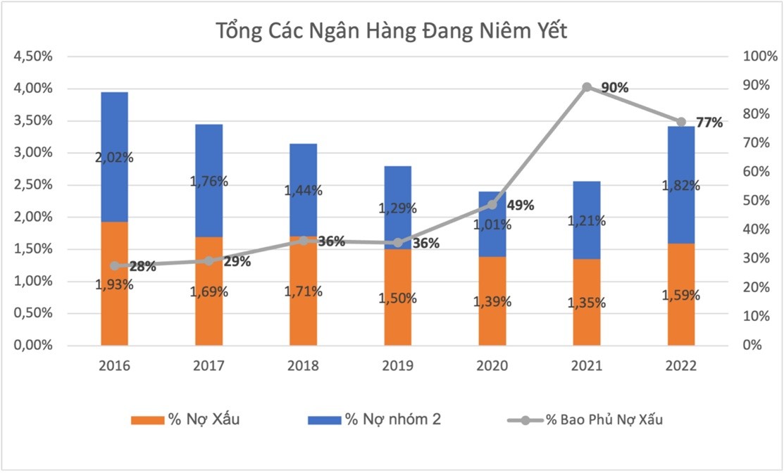 Những khó khăn của thị trường bất động sản và thị trường vốn là trái phiếu doanh nghiệp, đặc biệt từ quý 3/2022 trở đi đã phản ánh vào bảng cân đối kế toán của các ngân hàng thông qua con số nợ xấu tăng nhanh trở lại, đặc biệt là nợ nhóm 2 ở cả các ngân hàng quốc doanh lẫn ngân hàng tư nhân. Tỷ lệ nợ nhóm 2 đạt mức cao nhất kể từ 2017 đến nay và cao hơn nhiều so với năm 2020 khi có dịch Covid – 19. Đi kèm đó là tỷ lệ bao phủ nợ xấu cũng sụt giảm đáng kể so với thời điểm cuối năm 2021.
