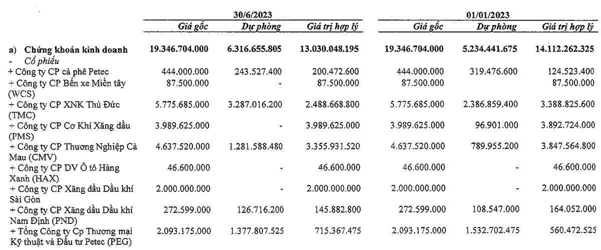 Song song đó, COM cũng dành 19,3 tỷ đồng đầu tư chứng khoán, nhưng đang phải trích lập dự phòng hơn 6,3 tỷ đồng. Trong danh mục đầu tư đến cuối tháng 6, COM dành hơn 5,77 tỷ đồng đầu tư mã TMC (trích lập dự phòng hơn 3,2 tỷ đồng); gần 4 tỷ đồng đầu tư PMS; hơn 4,6 tỷ đồng đầu tư CMV (trích lập dự phòng hơn 1,28 tỷ đồng)…