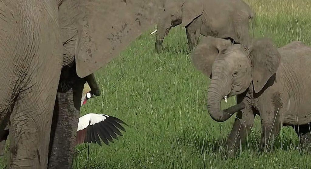 Bất ngờ, trong khi con sếu vương miện xám đang chăm bẵm cho những quả trứng của mình thì một đàn voi khổng lồ đi ngang qua và thản nhiên đến khu vực lãnh địa của con chim để gặm cỏ.
