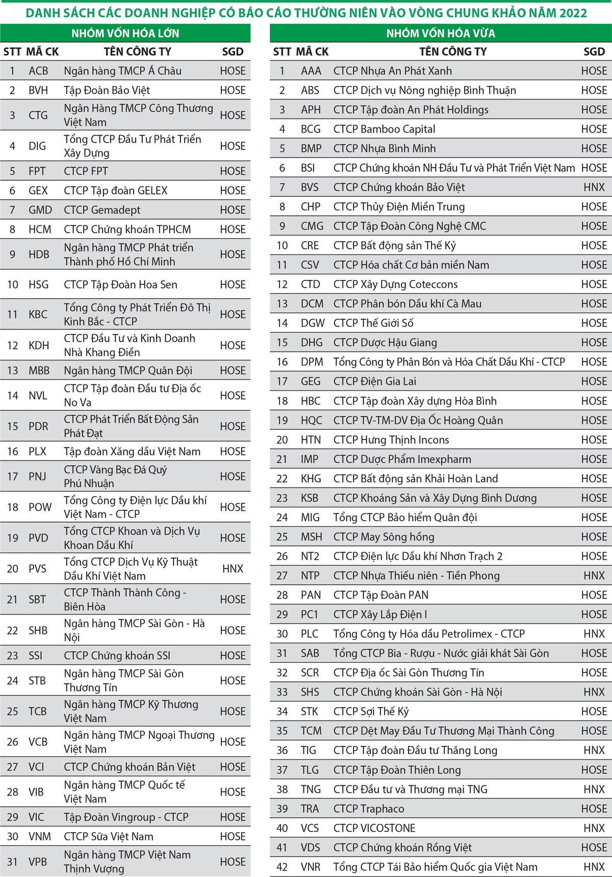 Ở hạng mục báo cáo thường niên, có 94 doanh nghiệp có báo cáo thường niên tốt nhất được bình chọn vào vòng chung khảo. Trong đó, 31 doanh nghiệp thuộc nhóm vốn hóa lớn, 42 doanh nghiệp thuộc nhóm vốn hóa vừa và 21 doanh nghiệp thuộc nhóm vốn hóa nhỏ.