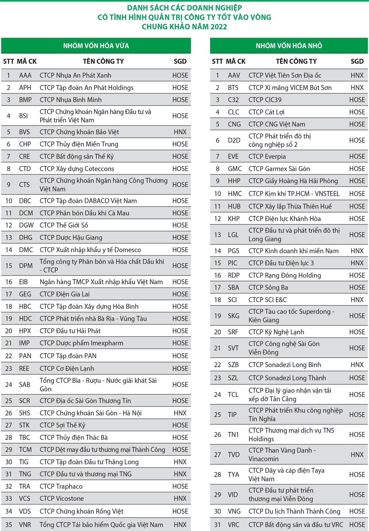 Ở hạng mục báo cáo quản trị công ty, có 99 doanh nghiệp có tình hình quản trị công ty tốt nhất được chọn vào vòng chung khảo, phân theo từng nhóm vốn hóa. Trong đó, 33 doanh nghiệp thuộc nhóm vốn hóa lớn, 35 doanh nghiệp thuộc nhóm vốn hóa vừa và 31 doanh nghiệp thuộc nhóm vốn hóa nhỏ.
