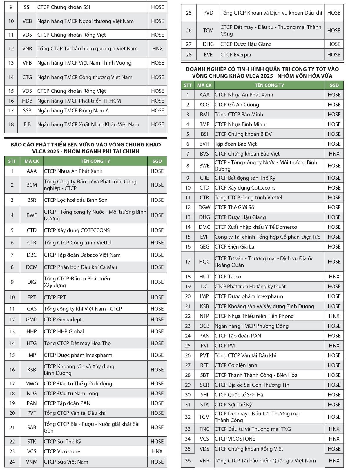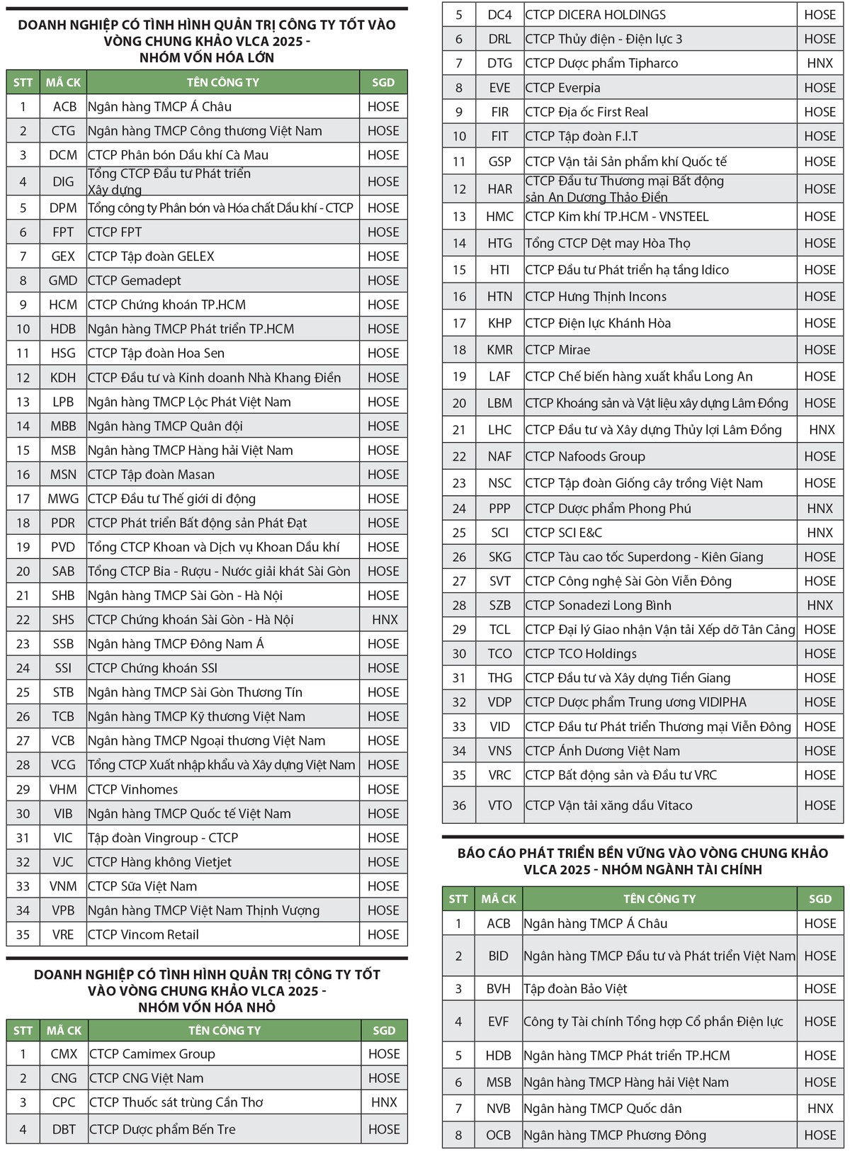 Có 107 doanh nghiệp được chọn vào vòng chung khảo: 35 doanh nghiệp vốn hóa lớn, 36 doanh nghiệp vốn hóa vừa và 36 doanh nghiệp vốn hóa nhỏ (xem danh sách, được xếp theo ABC). Việc chấm điểm dựa trên các tài liệu công bố rộng rãi như báo cáo thường niên, báo cáo quản trị công ty, báo cáo phát triển bền vững, điều lệ, quy chế quản trị, tài liệu họp đại hội đồng cổ đông… đến 30/4/2025 (thông tin đại hội đồng cổ đông đến 30/6/2025 với doanh nghiệp gia hạn họp).