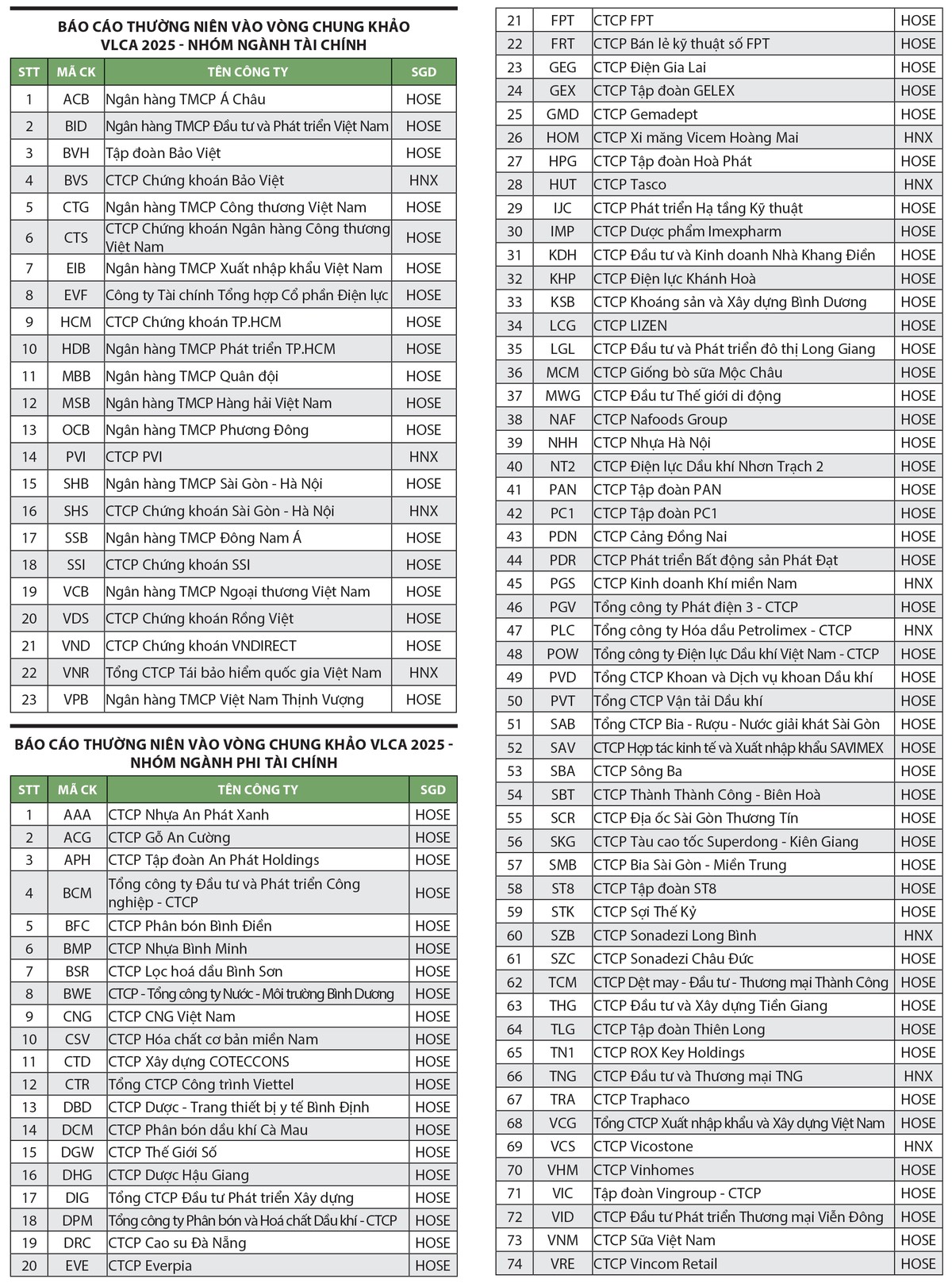 Kết quả, 97 doanh nghiệp có báo cáo thường niên tốt nhất được chọn vào vòng chung khảo, gồm 23 doanh nghiệp tài chính và 74 doanh nghiệp phi tài chính (danh sách theo thứ tự ABC mã chứng khoán, không phải xếp hạng).