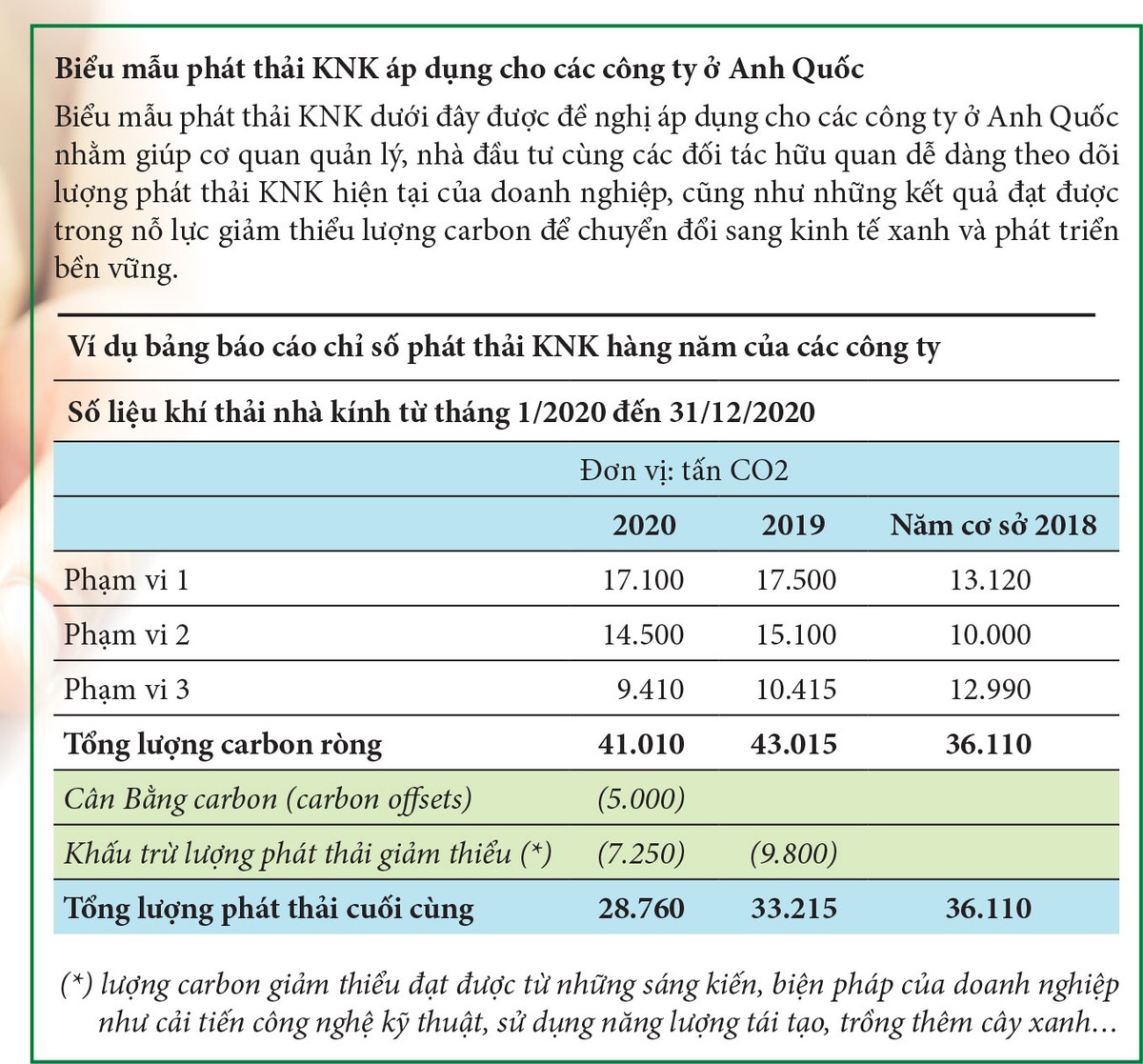 Thông tư 96/2020/TT-BTC của Bộ Tài chính ban hành Hướng dẫn công bố thông tin trên thị trường chứng khoán có hiệu lực từ ngày 1/1/2021 đã đưa nội dung yêu cầu các công ty đại chúng phải công bố thông tin về tổng lượng phát thải KNK trực tiếp và gián tiếp, đồng thời nêu rõ các sáng kiến và biện pháp giảm thiểu phát thải KNK trong mẫu lập báo cáo thường niên từ năm 2021 trở đi.