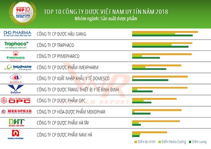 Bảng xếp hạng Top 10 công ty dược uy tín năm 2018 vừa được Công ty cổ phần Báo cáo đánh giá Việt Nam (Vietnam Report), phối hợp cùng Báo điện tử Vietnamnet, công bố, theo đó Dược Hậu Giang, Công ty cổ phần Traphaco, Công ty cổ phần Pymepphaco lần lượt đứng thứ 1 và thứ 2 và thứ 3 trong Bảng xếp hạng.