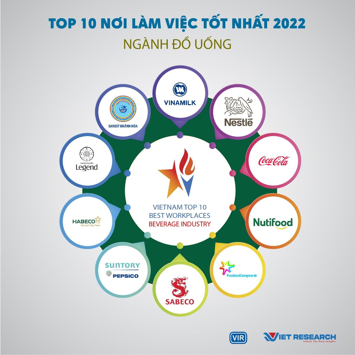 Qua nghiên cứu và đánh giá trên các tiêu chí liên quan đến cơ hội nghề nghiệp, lương thưởng và phúc lợi, văn hóa doanh nghiệp, sự cân bằng giữa công việc và cuộc sống và các yếu tố khác cũng như tiềm năng tăng trưởng và uy tín của doanh nghiệp và thương hiệu nhà tuyển dụng trên thị trường, Viet Research và Báo Đầu tư đưa ra danh sách Top 10 nơi làm việc tốt nhất trong ngành Thực phẩm – Đồ uống bao gồm: