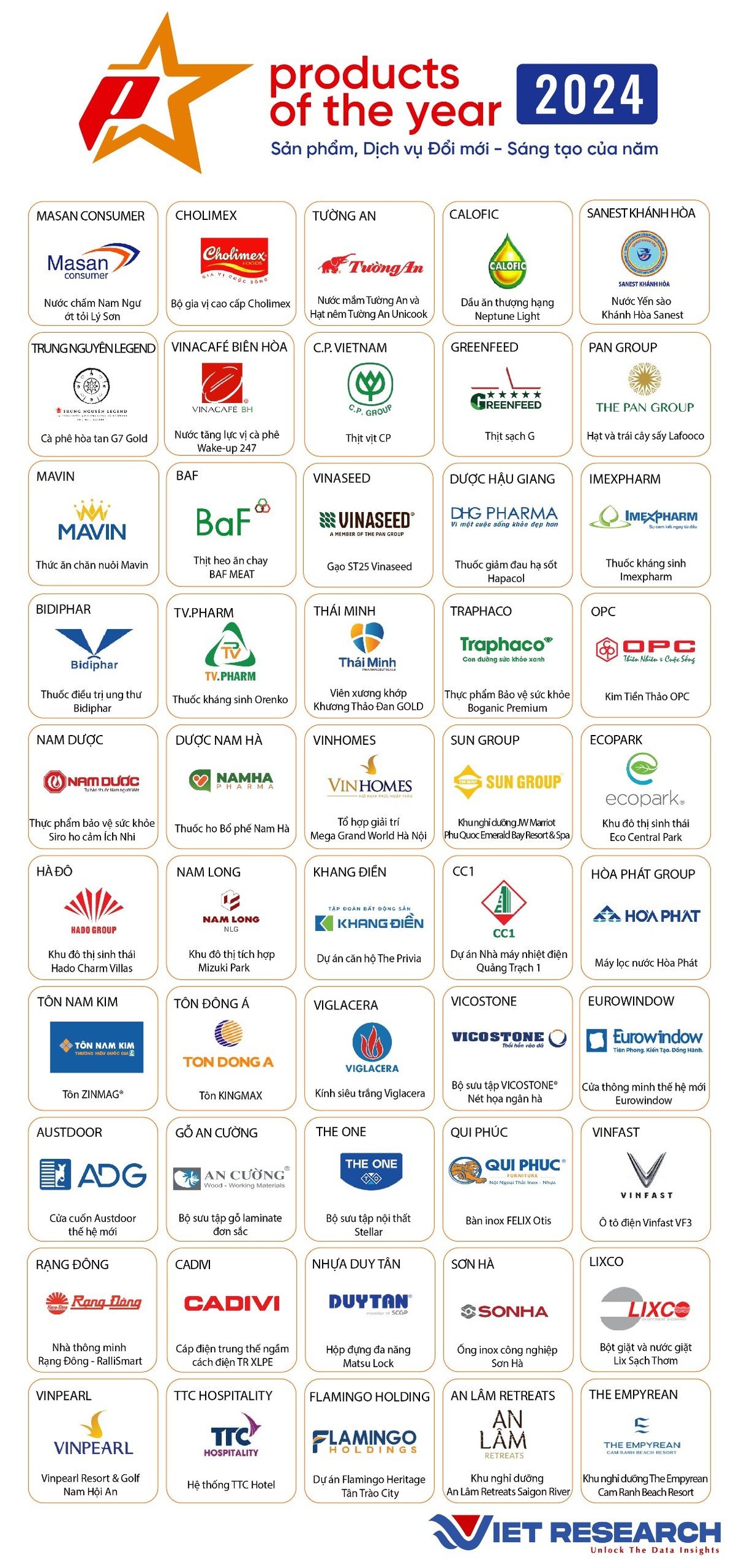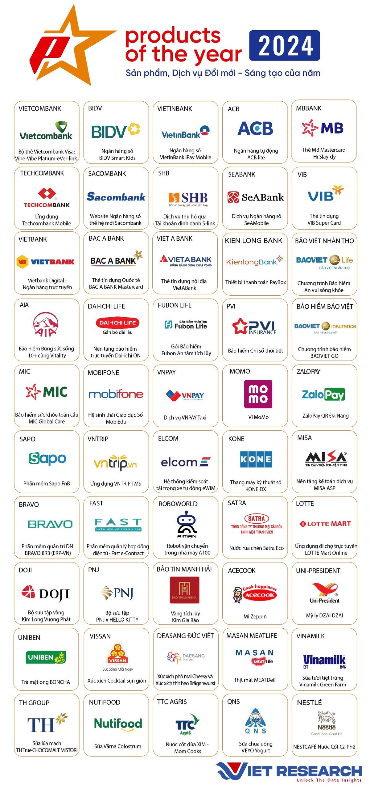 Chương trình mang ý nghĩa là cầu nối giúp doanh nghiệp có cơ hội quảng bá sản phẩm, dịch vụ tới rộng khắp khách hàng, đối tác và công chúng, đồng thời trợ giúp người tiêu dùng lựa chọn thông minh các sản phẩm dịch vụ mới, xuất sắc, có chất lượng phù hợp với nhu cầu và sở thích. Theo đó, danh sách các sản phẩm dịch vụ xuất sắc đạt danh hiệu “Product of the Year – Top 100 sản phẩm dịch vụ đổi mới sáng tạo của năm 2024” được công bố như dưới đây: