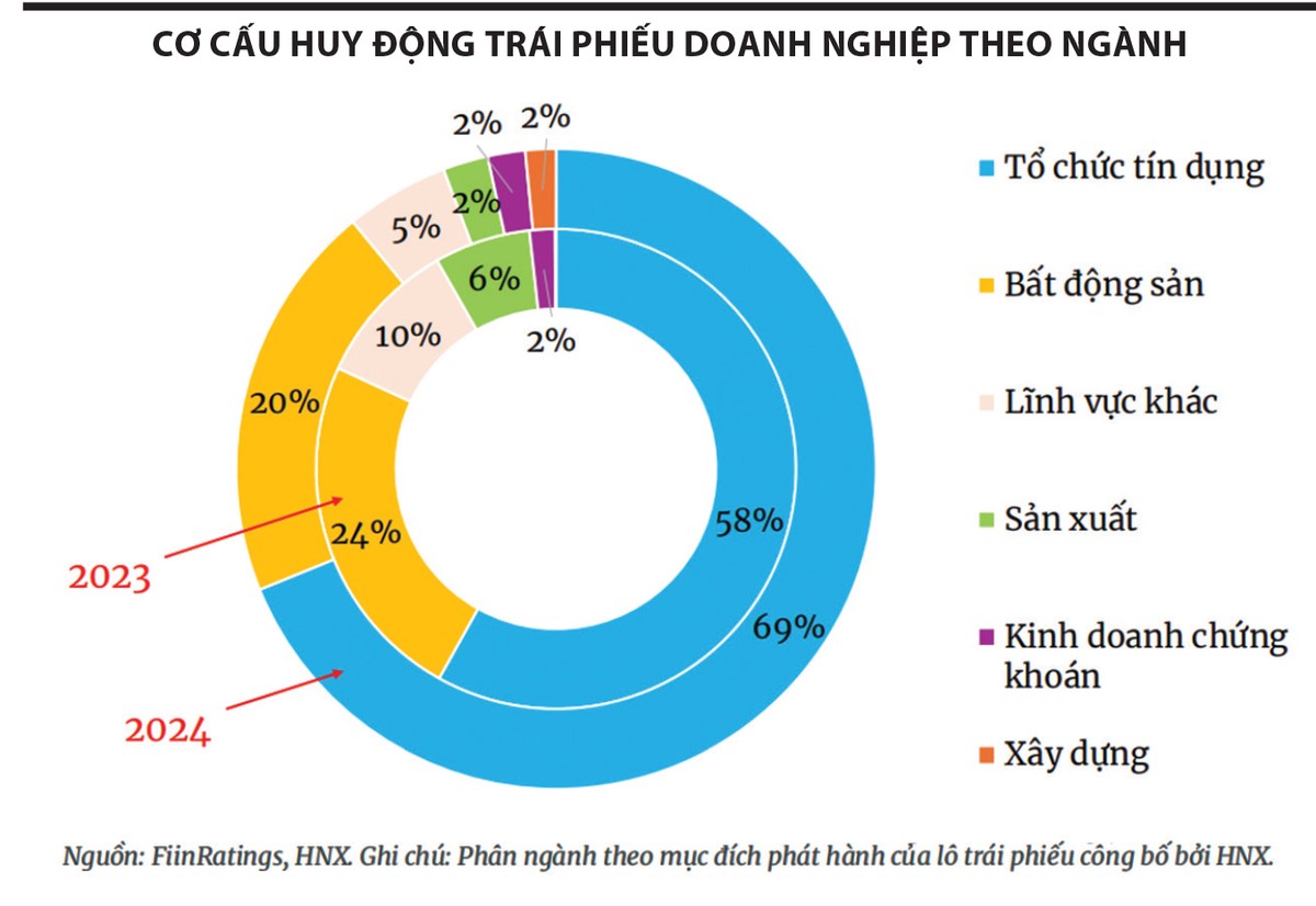 Năm 2024, theo dữ liệu từ Fiin Ratings, thị trường trái phiếu doanh nghiệp hồi phục, với 473 đợt phát hành, trị giá 461.000 tỷ đồng, tăng 33,1% so với năm 2023, phản ánh nhu cầu vốn cho hoạt động sản xuất - kinh doanh của doanh nghiệp gia tăng. Tuy nhiên, khi xét về cơ cấu huy động theo ngành, các tổ chức tín dụng chiếm 69% giá trị phát hành (với mục tiêu bổ sung vốn cấp 2, đáp ứng các tỷ lệ an toàn khi nhu cầu tín dụng tăng mạnh trở lại). Số liệu này cho thấy, kênh huy động vốn chính của các doanh nghiệp vẫn là vốn vay tại ngân hàng thương mại, nhưng cũng cho thấy tiềm năng, dư địa phát triển của thị trường trái phiếu doanh nghiệp.