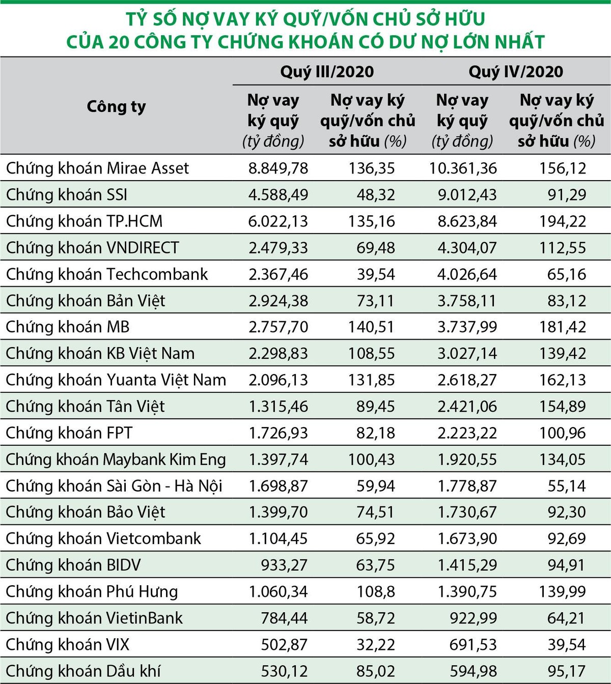 Cụ thể, với tổng dư nợ hơn 70.000 tỷ đồng, hệ số tổng dư nợ/vốn chủ sở hữu của toàn bộ các công ty chứng khoán đạt mức cao nhất trong lịch sử, dù khối công ty này đã thực hiện tăng vốn trong thời gian trước đó. Theo số liệu báo cáo quý IV/2020, tỷ lệ này đạt 93,25%, vượt qua cả mức đỉnh quý I/2018. Không ít công ty gần chạm ngưỡng cho phép theo quy định là được cho vay tối đa 200% vốn chủ sở hữu.
