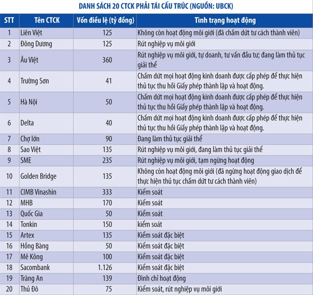 Thực tế cho thấy, sau 1 năm thực hiện Đề án tái cấu trúc TTCK và 2 năm thực hiện Đề án tái cấu trúc các CTCK, đã có 3 CTCK đang tiến hành giải thể là: Sao Việt, Chợ Lớn và Âu Việt. Đặc biệt, mới đây với việc lần đầu tiên UBCK tổng hợp và công khai danh tính 20 CTCK (chi tiết xem bảng) đang trong diện tái cấu trúc, cho thấy quá trình tái cấu trúc CTCK đang diễn ra quyết liệt. Trong số này, thị trường, NĐT đang đặt dấu hỏi về khả năng thanh khoản của nhiều CTCK.