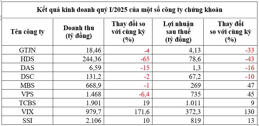 Công ty Chứng khoán VPS cũng báo lợi nhuận sau thuế quý I đạt 735 tỷ đồng, tăng 45% so với cùng kỳ, dù doanh thu đạt 1.468,4 tỷ đồng, giảm 6,4% so với cùng kỳ. Nguyên nhân chính doanh thu đi xuống là do doanh thu mảng môi giới chứng khoán giảm gần 40% về còn 579 tỷ đồng. Đáng chú ý, trong quý I/2025, VPS vẫn tiếp tục đứng đầu thị phần môi giới sàn HOSE.