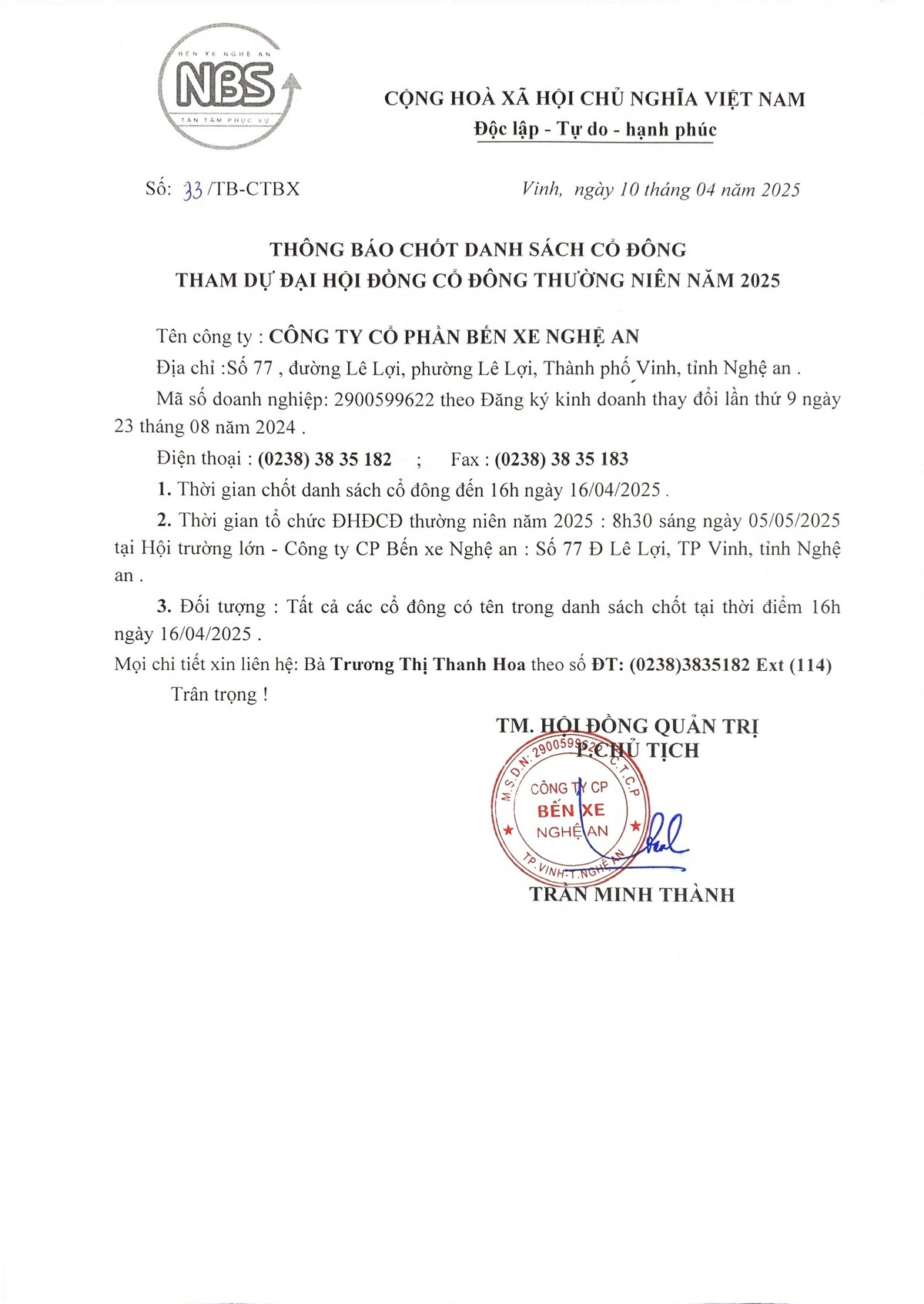 Công ty cổ phần Bến xe Nghệ An (NBS) thông báo chốt danh sách cổ đông tham dự đại hội đồng cổ đông thường niên năm 2025 15/04/2025 07:05