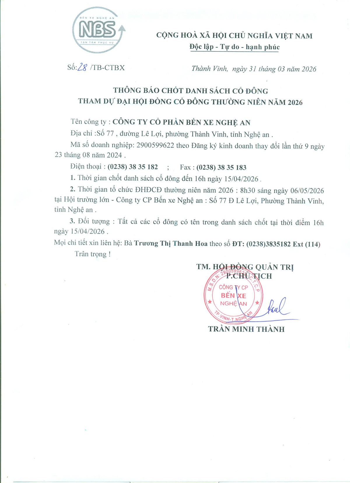 Công ty Cổ phần Bến xe Nghệ An (NBS): Thông báo chốt danh sách cổ đông tham dự đại hội đồng cổ đông thường niên năm 2026