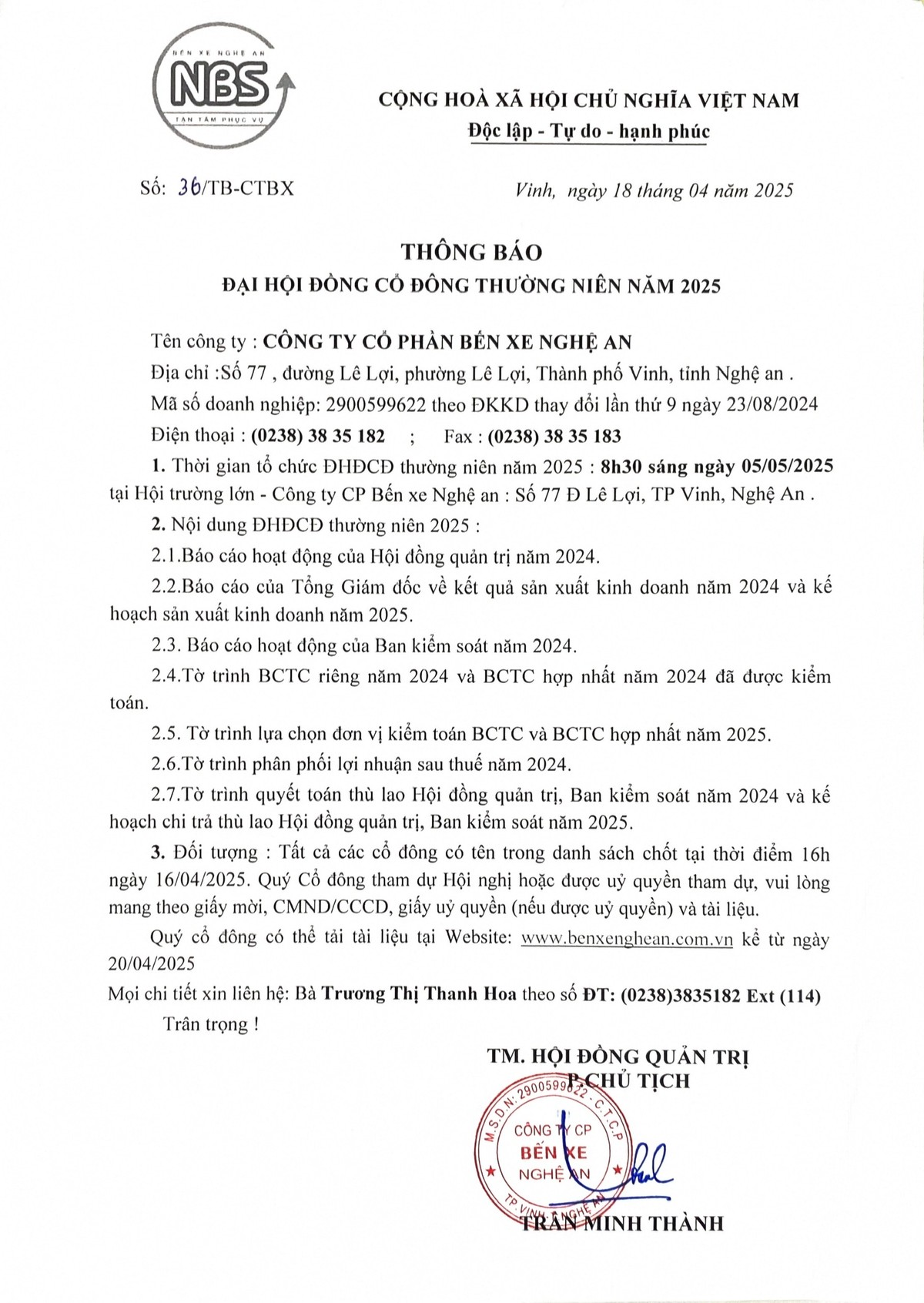 Công ty cổ phần Bến xe Nghệ An (NBS) thông báo chốt danh sách cổ đông tham dự đại hội đồng cổ đông thường niên năm 2025 15/04/2025 07:05