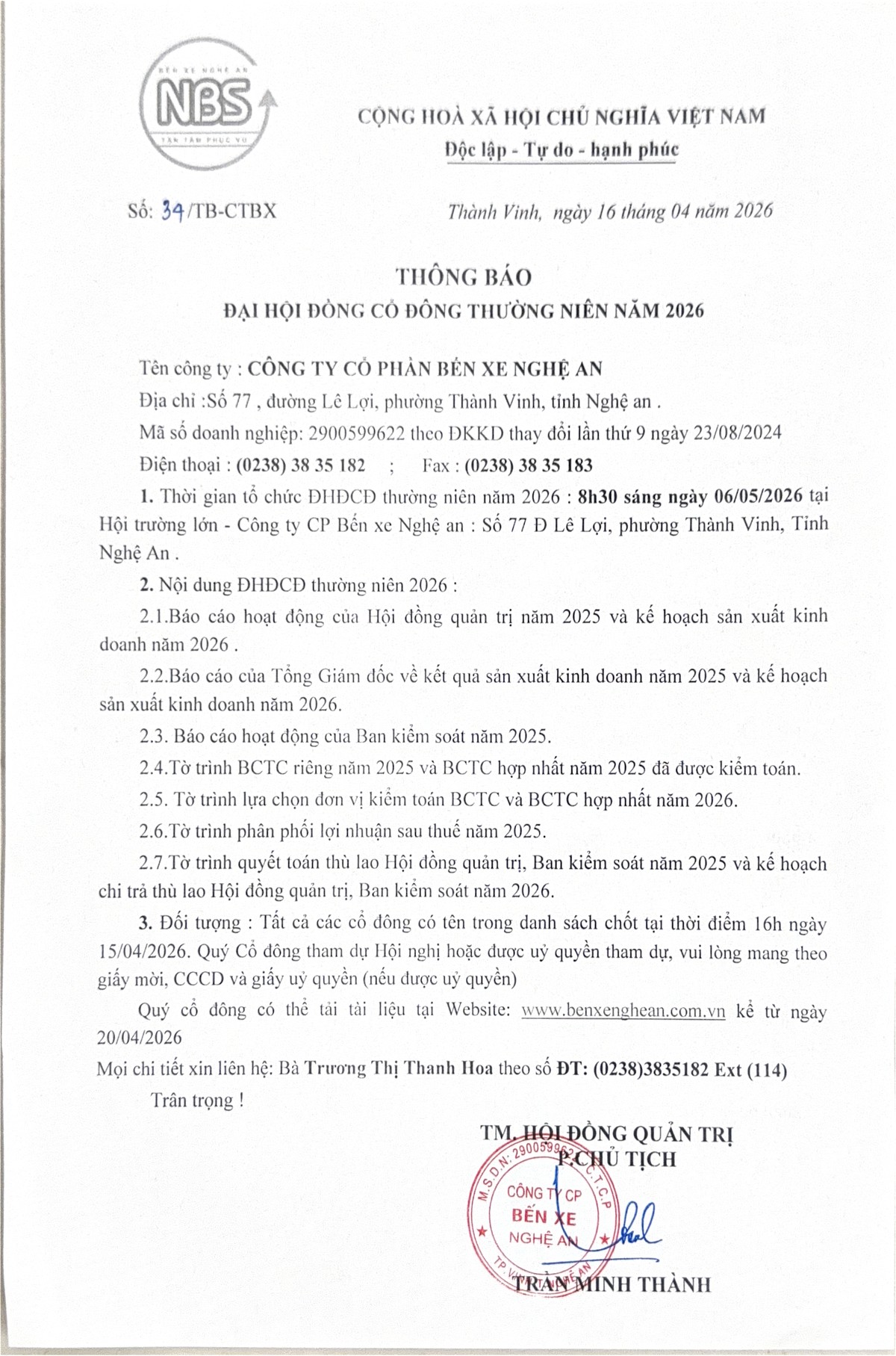 Công ty cổ phần Bến xe Nghệ An (NBS) thông báo Đại hội đồng cổ đông thường niên năm 2025 21/04/2025 08:00