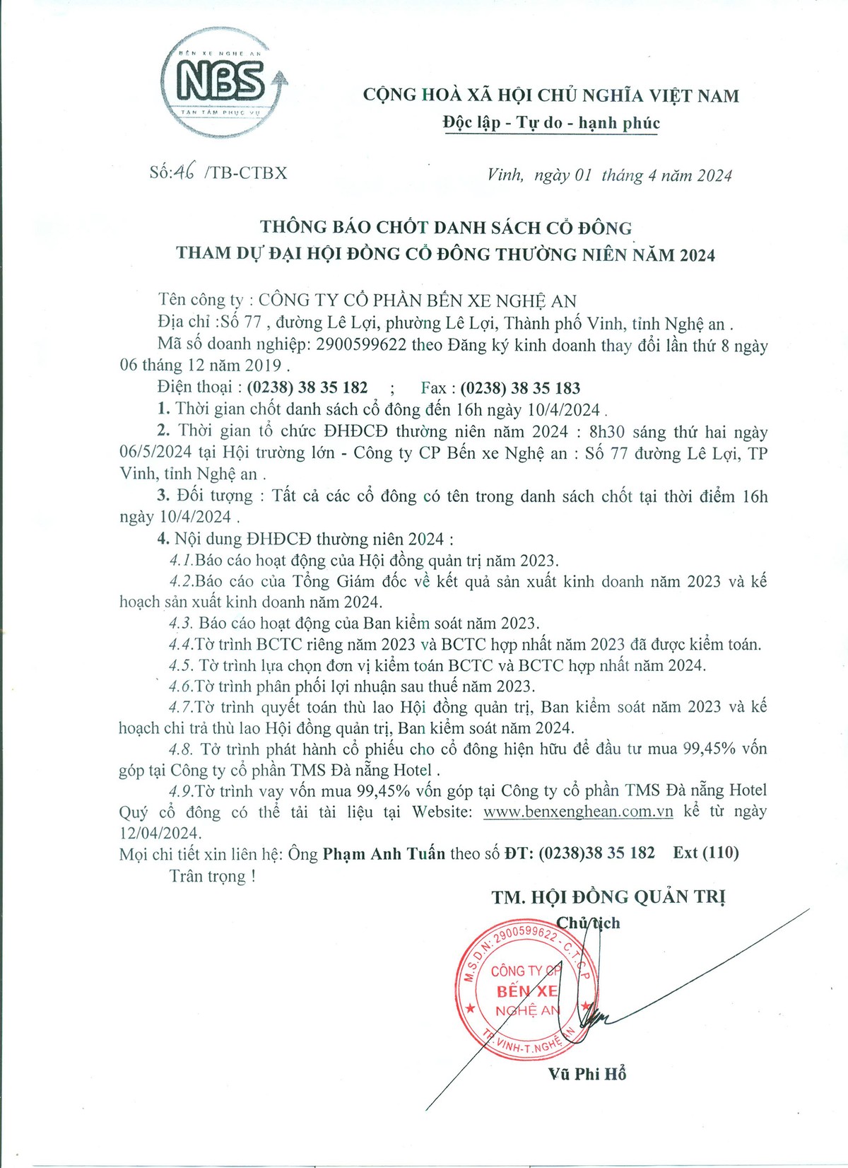 Tin liên quan Tiếng Anh trong Đại hội đồng cổ đông, bước chuyển mình quan trọng của doanh nghiệp Việt 02/04/2024 09:07 Đại hội đồng cổ đông thường niên 2024 VIB: Tín dụng quý I tăng 1%, lợi nhuận đạt 2.600 tỷ đồng 02/04/2024 11:58 Kinh Bắc (KBC) gia hạn Đại hội đồng cổ đông thường niên năm 2024 do vừa tổ chức đại hội bất thường 02/04/2024 17:39 Từ khóa NBS Công ty Cổ phần Bến xe Nghệ An