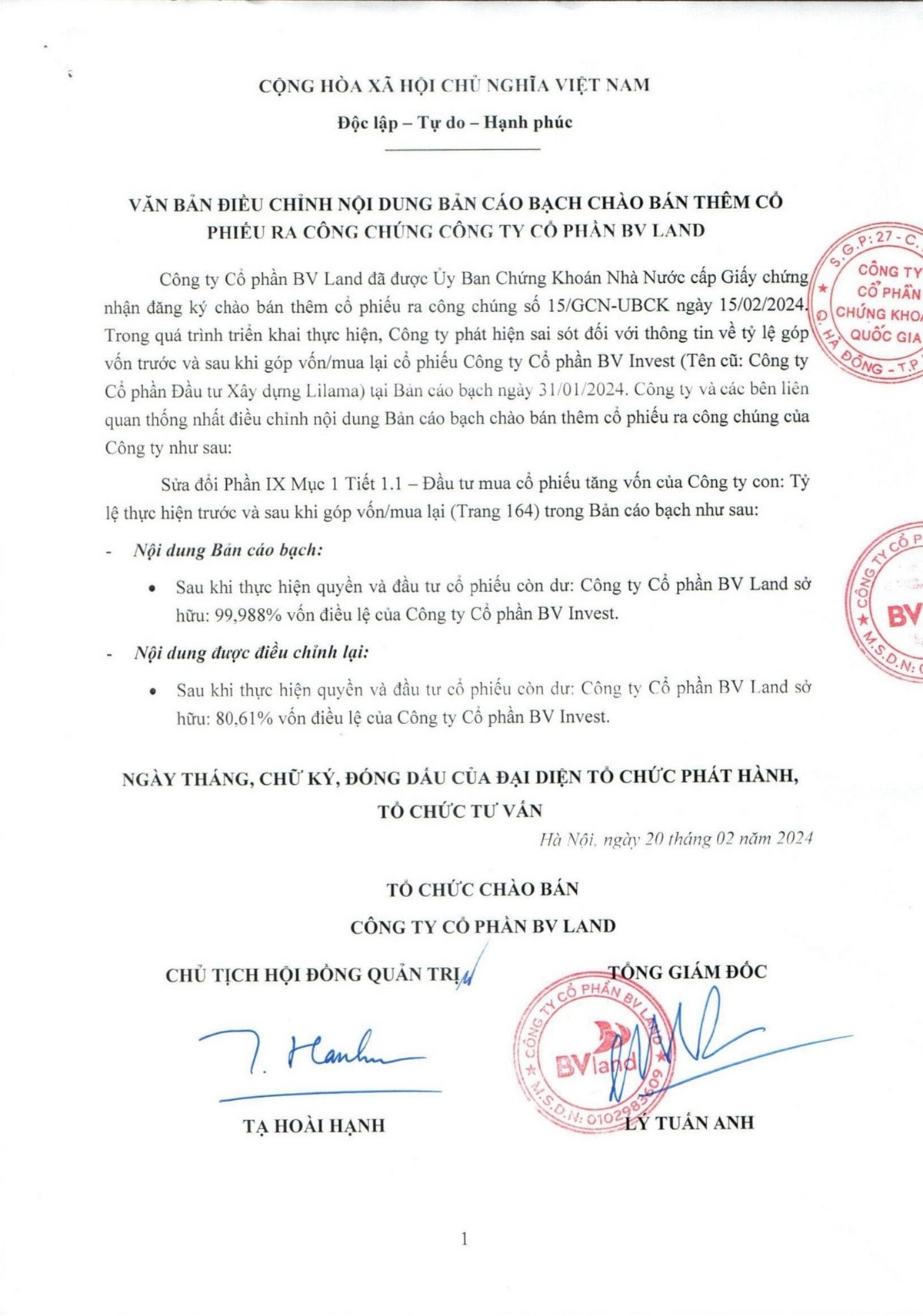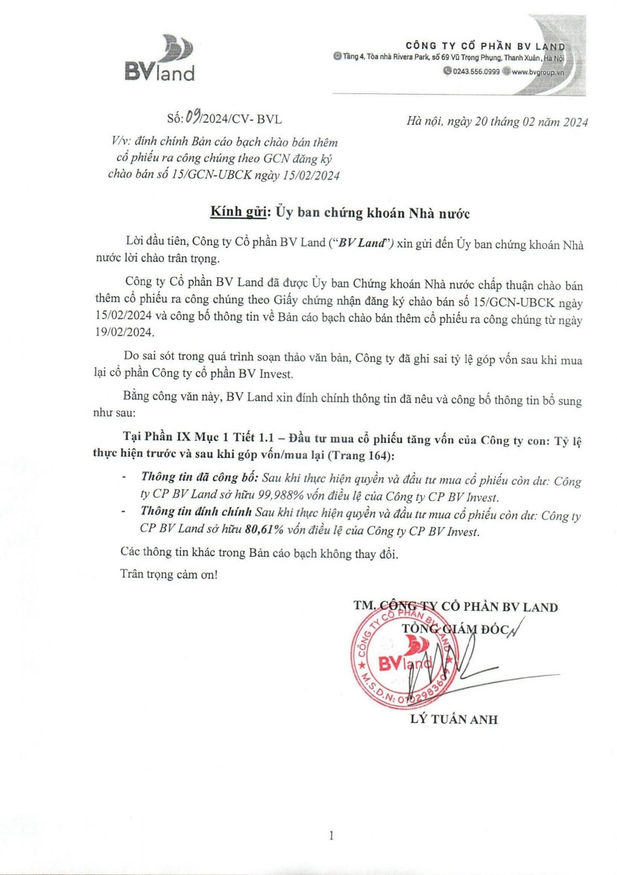Công ty cổ phần BV Land: Đính chính thông tin bản cáo bạch chào bán thêm cổ phiếu ra công chúng theo GCN chào bán số 15/GCN-UBCK ngày 15/02/2024