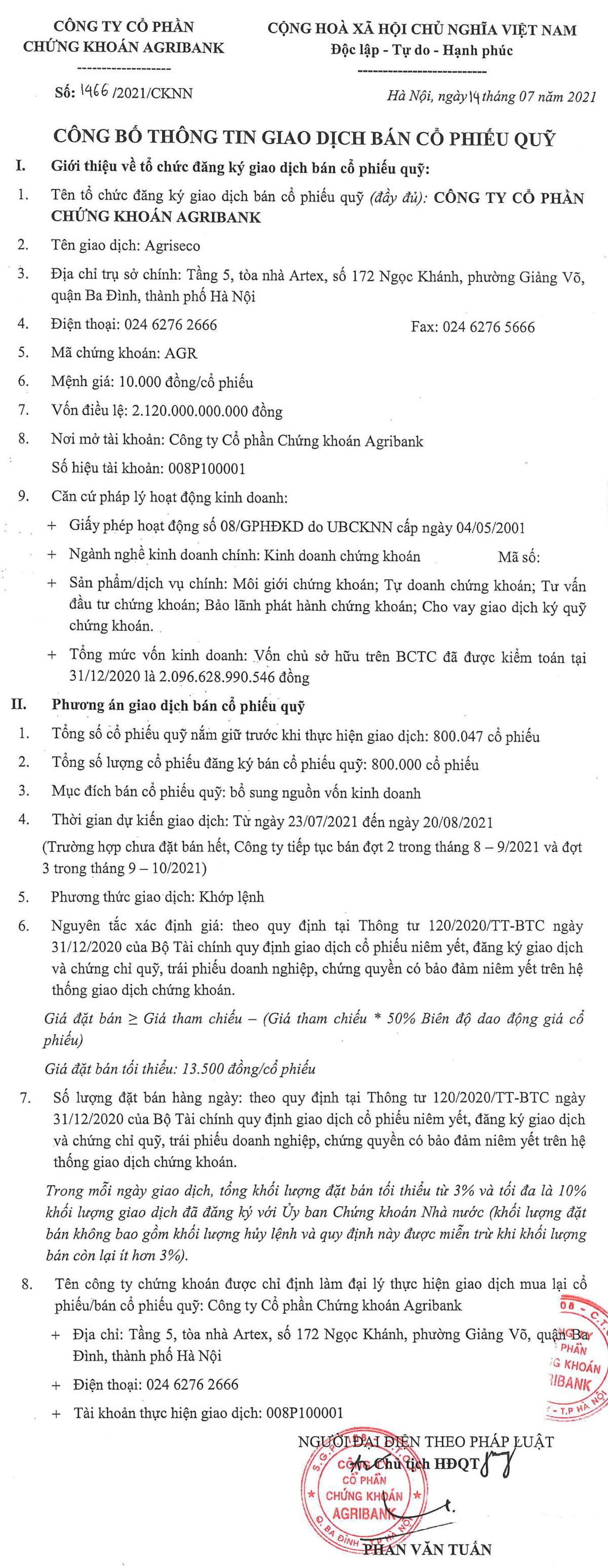 Công ty cổ phần Chứng khoán Agribank công bố thông tin giao dịch bán cổ phiếu quỹ