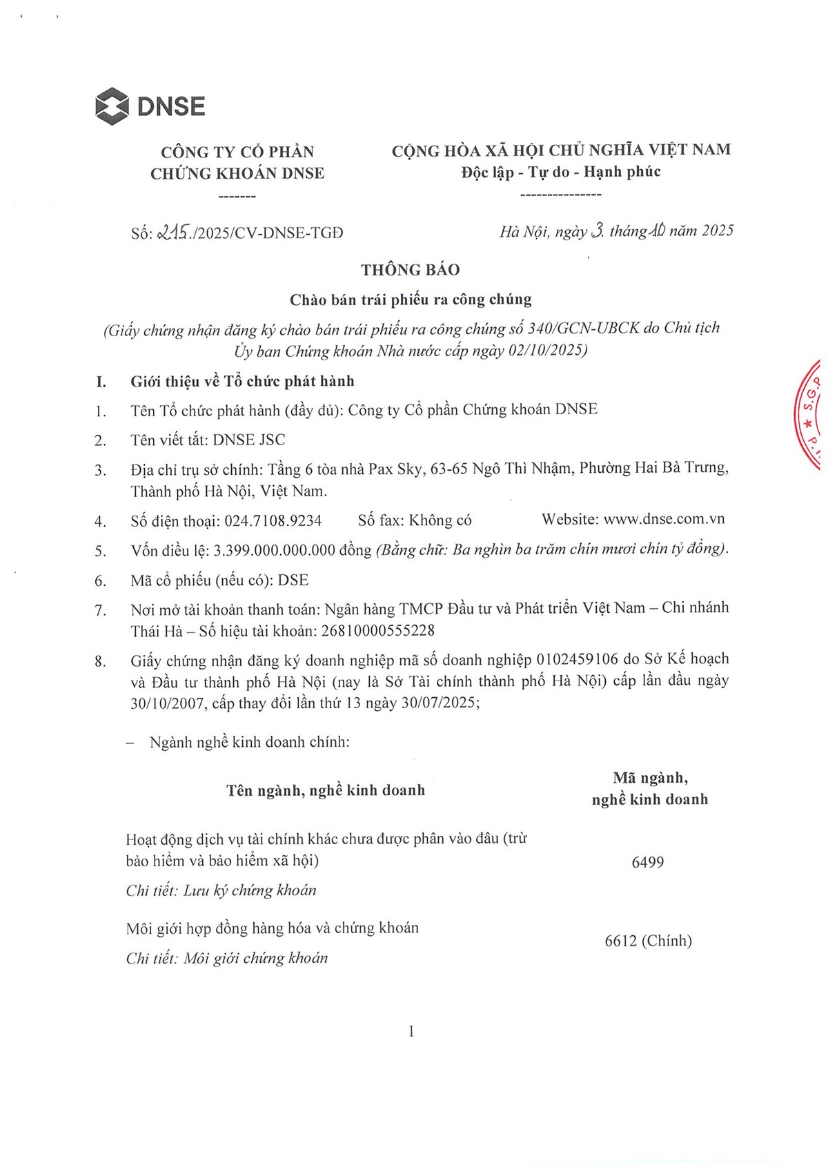 Công ty Cổ phần Chứng khoán DNSE (DSE): Thông báo chào bán cổ phiếu ra công chúng (Kỳ 1) 05/10/2025 07:00