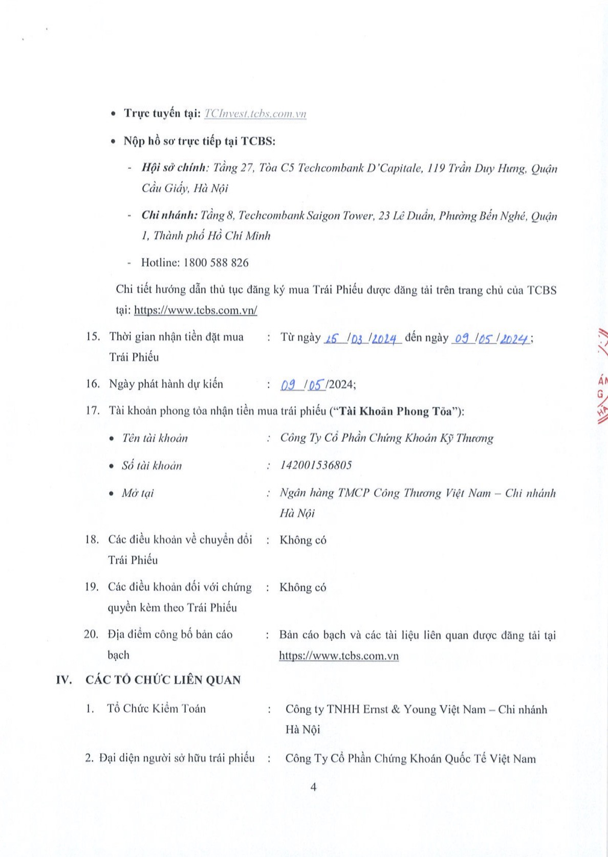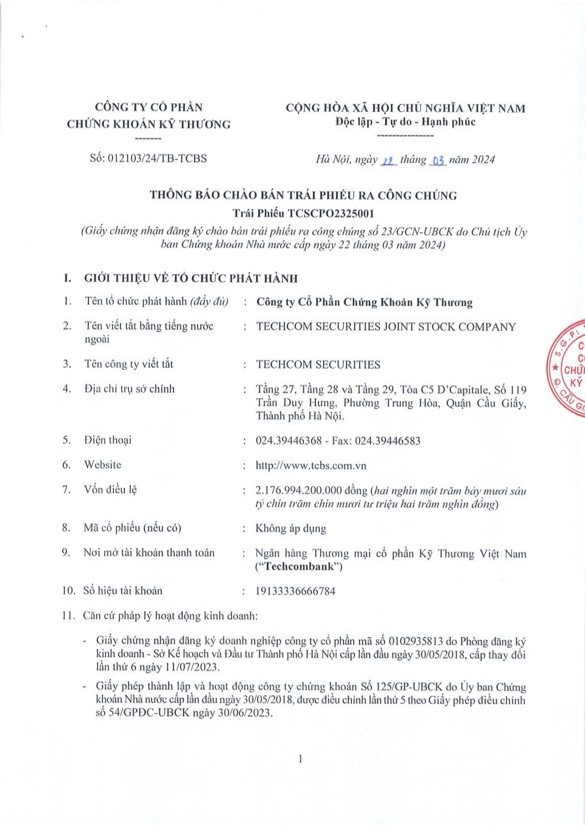 Công ty Cổ phần Chứng khoán Kỹ Thương (TCBS) thông báo chào bán trái phiếu ra công chúng đợt 1 (TCSCPO2325001) theo GCNĐK chào bán số 23/GCN-UBCK do Chủ tịch UBCKNN cấp ngày 22/03/2024 22/03/2024 21:55