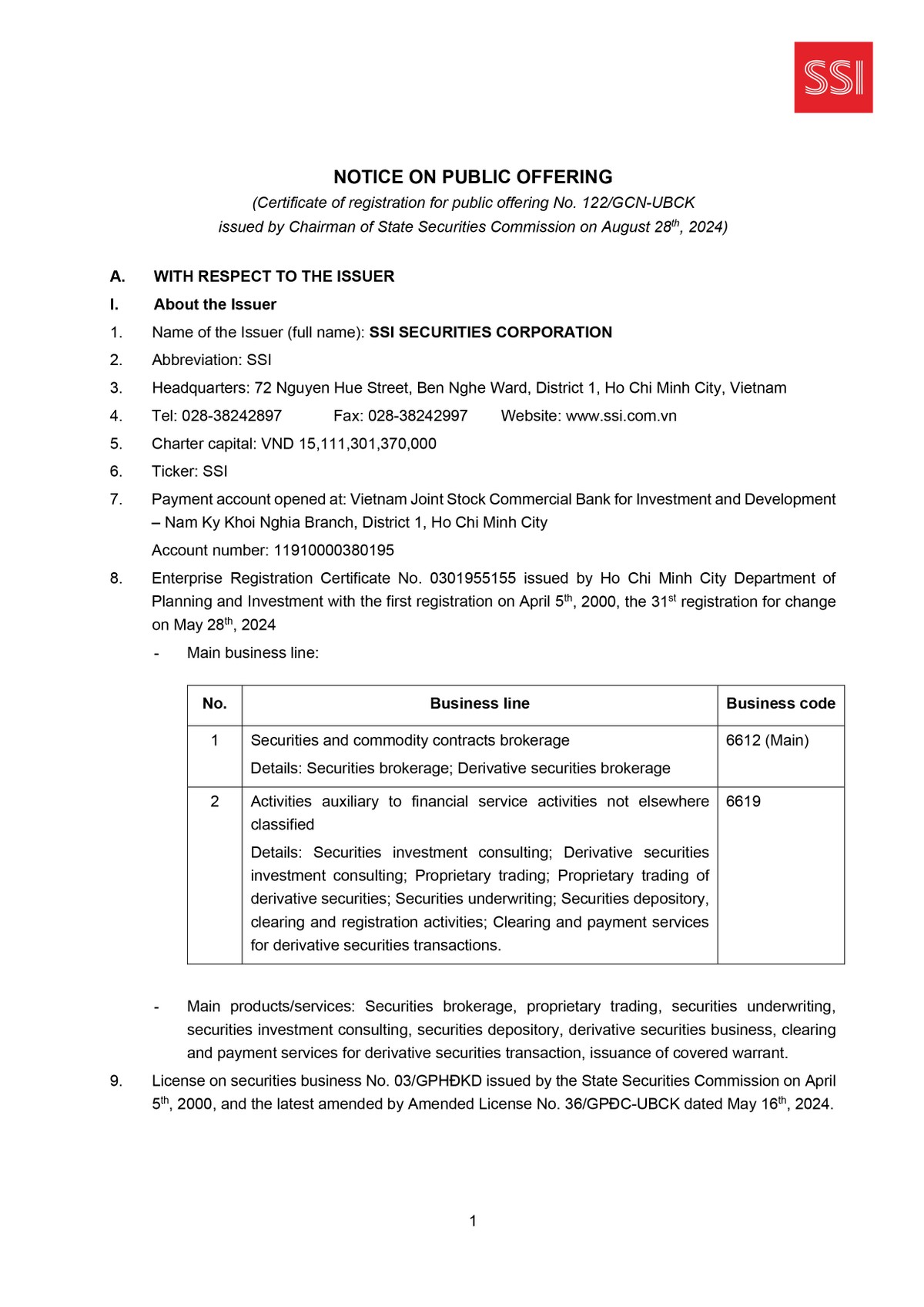 Tin liên quan Công ty cổ phần Chứng khoán SSI (SSI) thông báo chào bán cổ phiếu ra công chúng 06/09/2024 09:54 Công ty cổ phần Chứng khoán SSI (SSI) thông báo chào bán cổ phiếu ra công chúng 07/09/2024 07:00 SSI được cấp giấy chứng nhận phát hành ra công chúng hơn 453 triệu cổ phiếu 29/08/2024 17:38 Từ khóa SSI