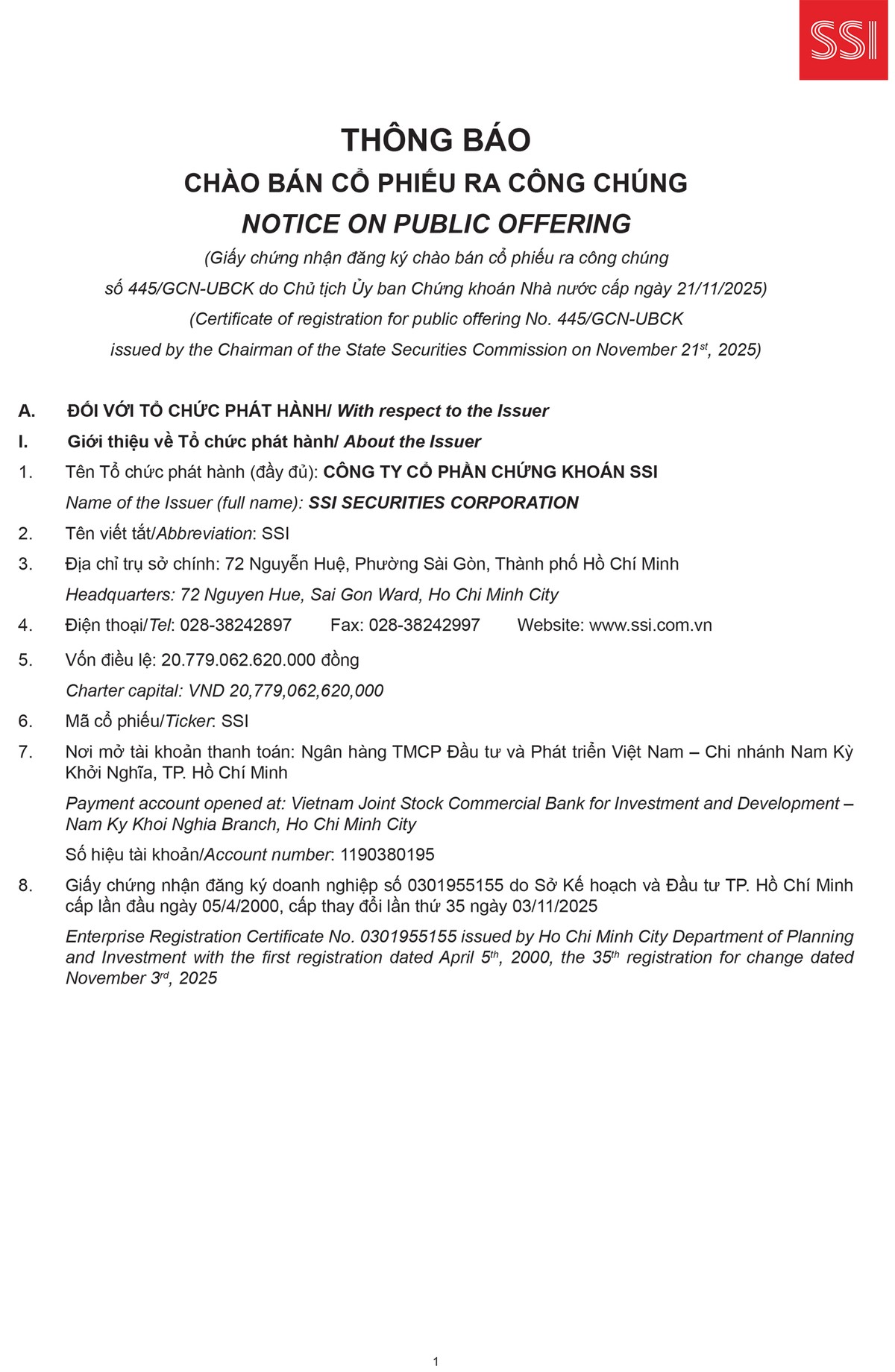 Vui lòng xem thông tin chi tiết tại đâyFor details, click here Tin liên quan Thị phần môi giới quý III/2025 HOSE: VPS duy trì dẫn đầu, thị phần của SSI lên mức cao nhất 5 năm 06/10/2025 20:33 SSI: Ngày GDKHQ trả cổ tức năm 2024 bằng tiền (10%) 22/09/2025 14:41 Đại hội đồng cổ đông bất thường SSI: 9 tháng hoàn thành 94% kế hoạch, thông qua tăng vốn lên gần 25.000 tỷ đồng 25/09/2025 18:42 Từ khóa SSI
