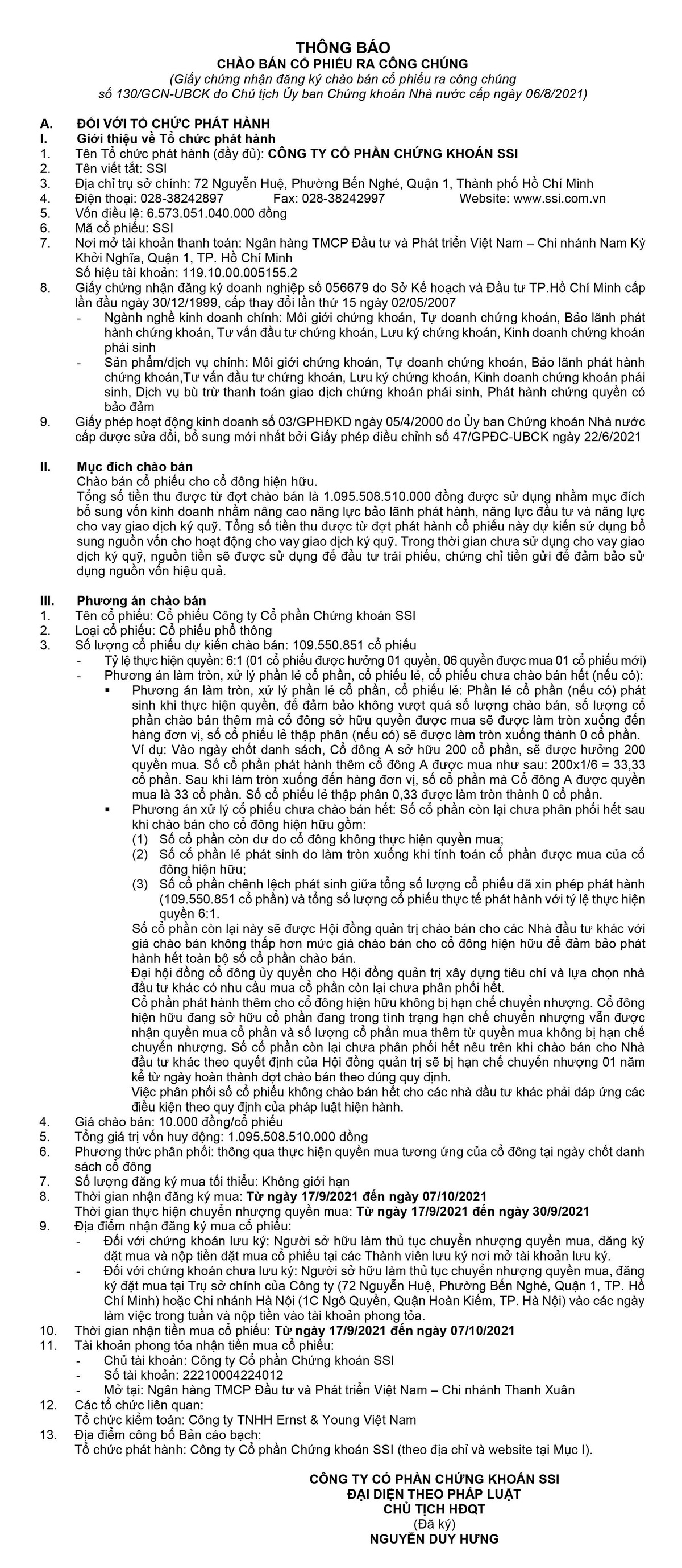 Công ty cổ phần Chứng khoán SSI thông báo chào bán cổ phiếu ra công chúng