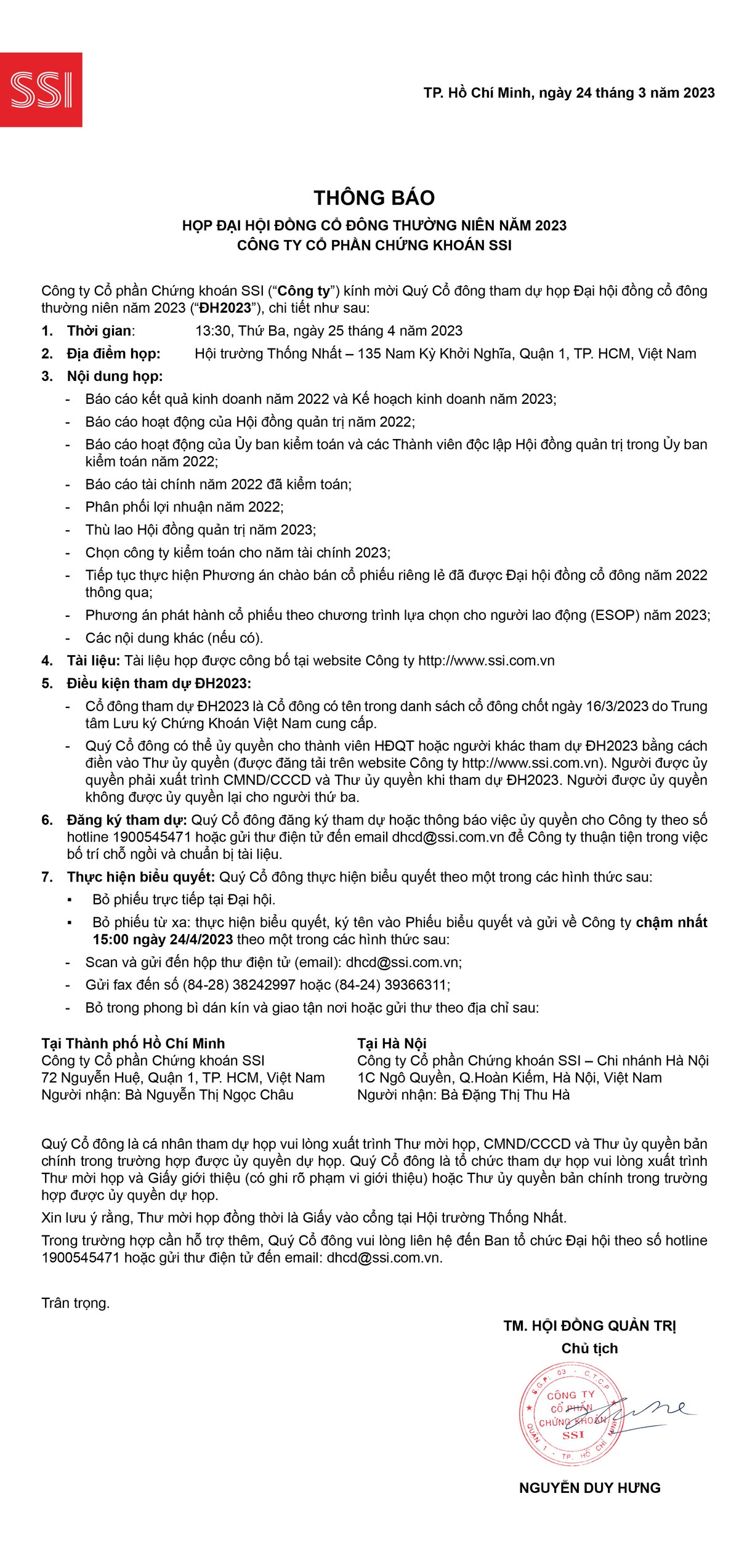 Công ty Cổ phần Chứng khoán SSI thông báo họp Đại hội đồng cổ đông thường niên năm 2023 10/04/2023 08:00