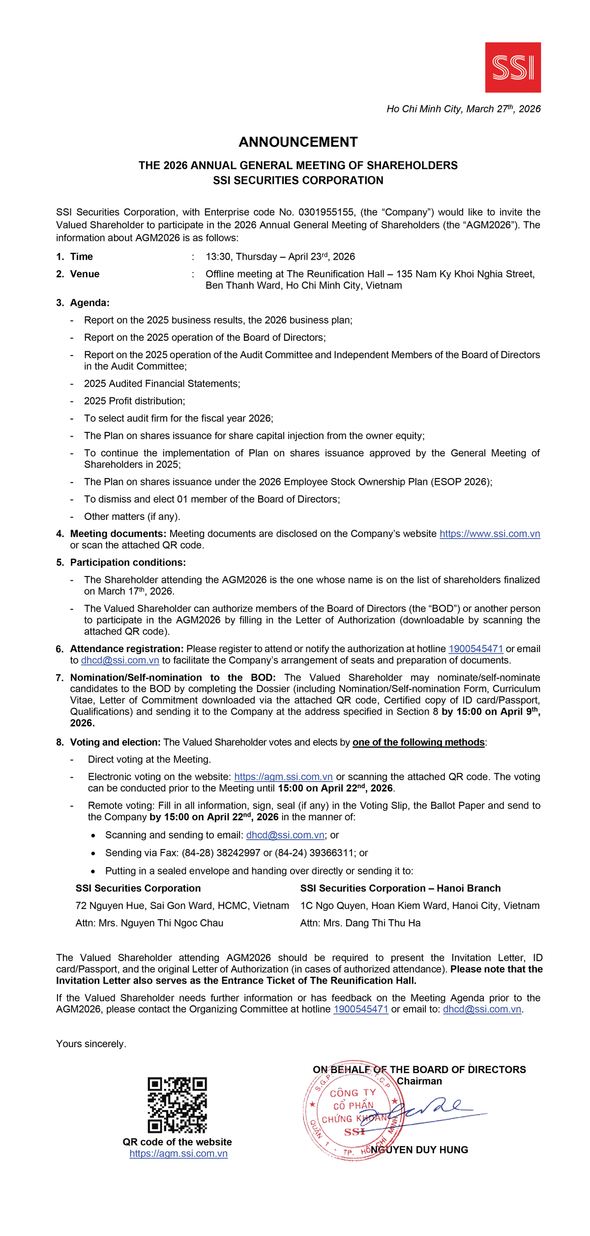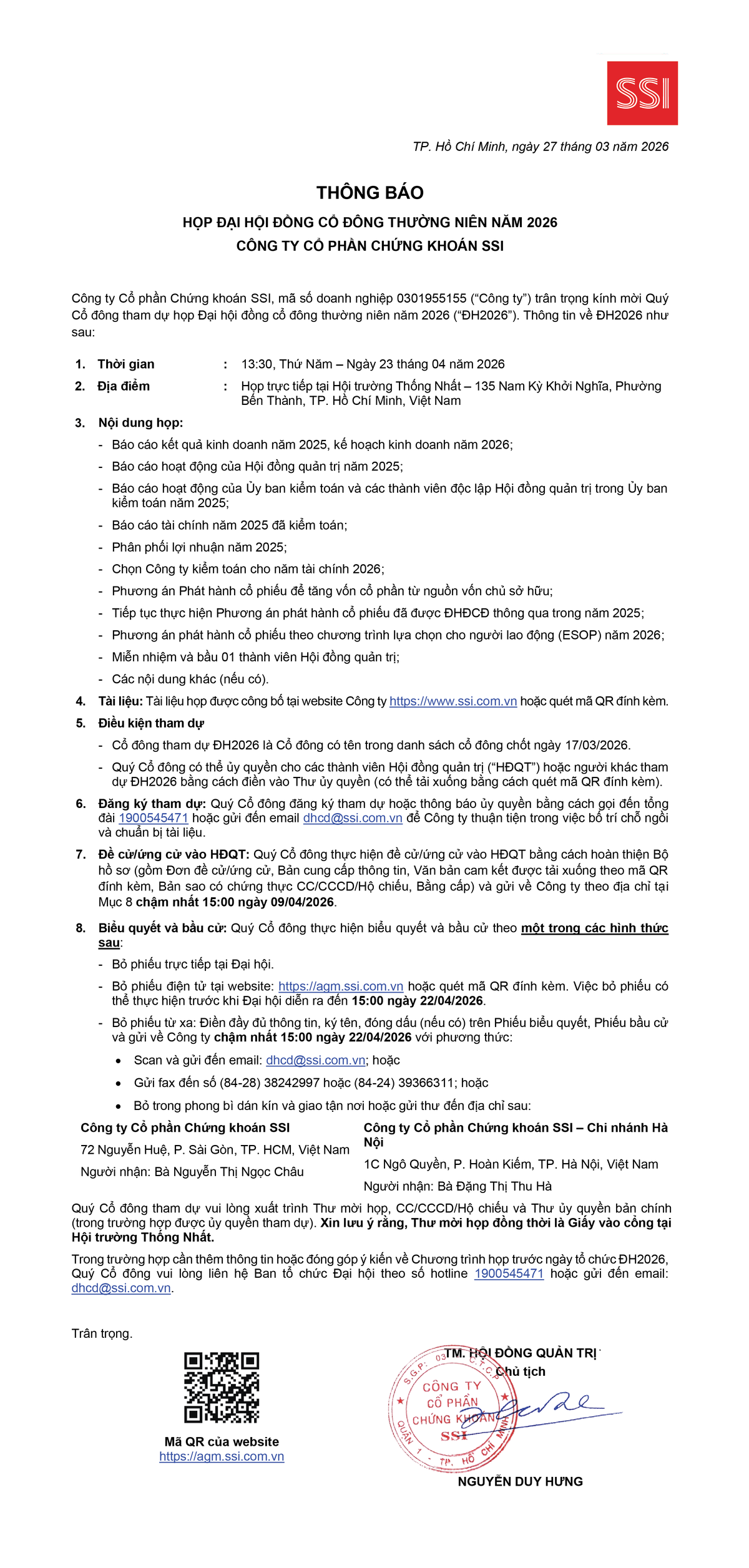 Vui lòng xem thông tin chi tiết Tại đây. For more details please click here. Chia sẻ Chia sẻ Tin liên quan SSI dự trình cổ đông kế hoạch lợi nhuận hơn 5.800 tỷ đồng 25/03/2026 10:02 SSI Research: Ngành điện 2026 phân hoá giữa áp lực El Nino và rủi ro địa chính trị 23/03/2026 14:03 SSI Research: Nâng hạng thị trường là xúc tác phục hồi sau cú sốc giá dầu 10/03/2026 15:51 Từ khóa SSI