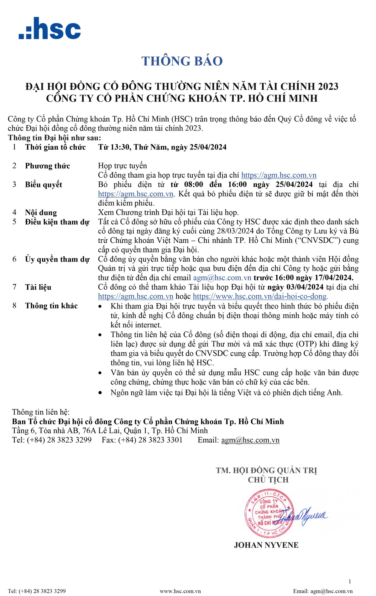 Chia sẻ Chia sẻ Tin liên quan Thông báo chào bán thỏa thuận quyền mua cổ phần CTCP Chứng khoán TP.HCM thuộc sở hữu của Công ty Đầu tư Tài chính Nhà nước TP.HCM 04/03/2024 08:00 Chủ tịch Chứng khoán HSC: Nhiều tổ chức nước ngoài quan tâm thị trường chứng khoán Việt Nam 28/02/2024 18:35 Chứng khoán HSC (HCM) báo lãi 842 tỷ đồng năm 2023, dư nợ margin tăng mạnh 19/01/2024 15:12 Từ khóa HSC ĐCHĐ