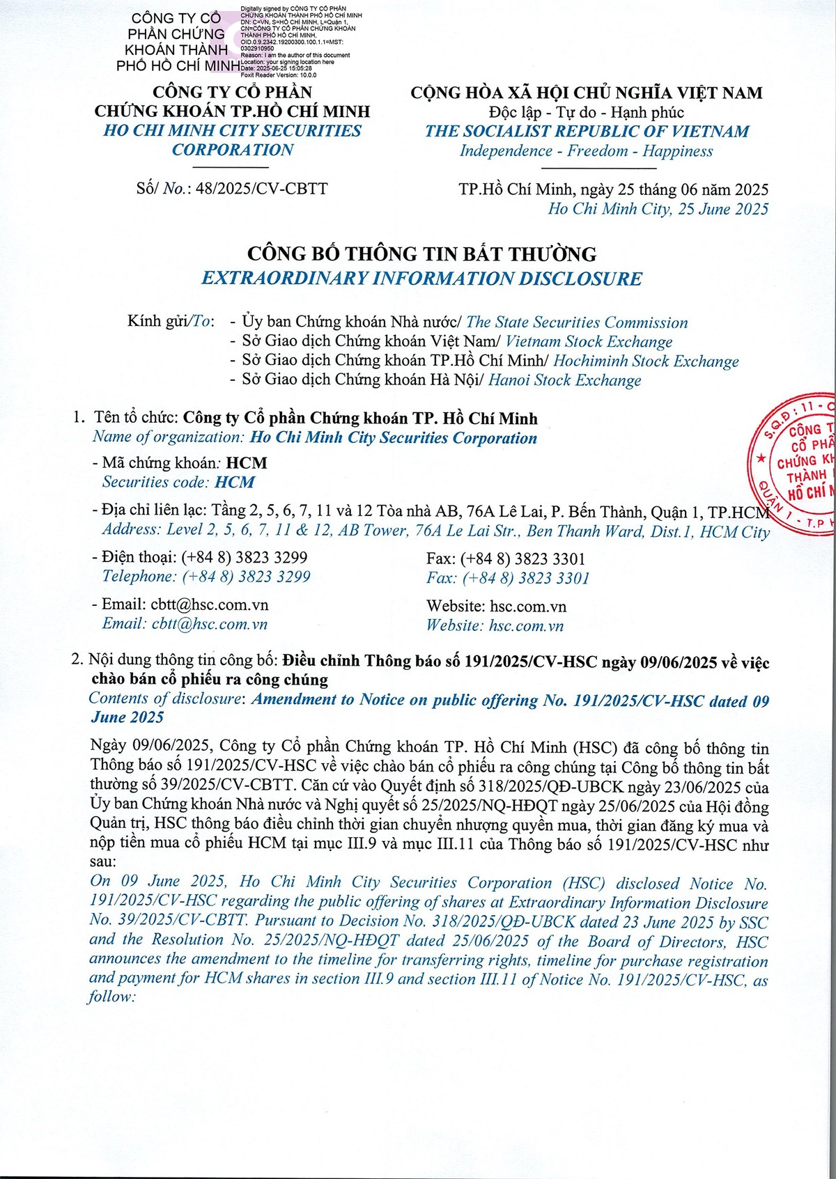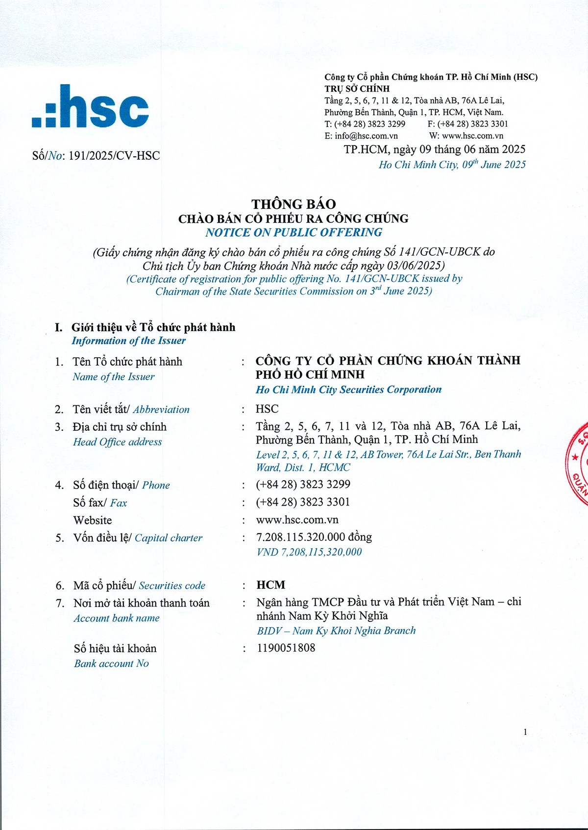 Công ty cổ phần Chứng khoán TP.HCM (HSC) điều chỉnh Thông báo chào bán cổ phiếu ra công chúng (kỳ 2)