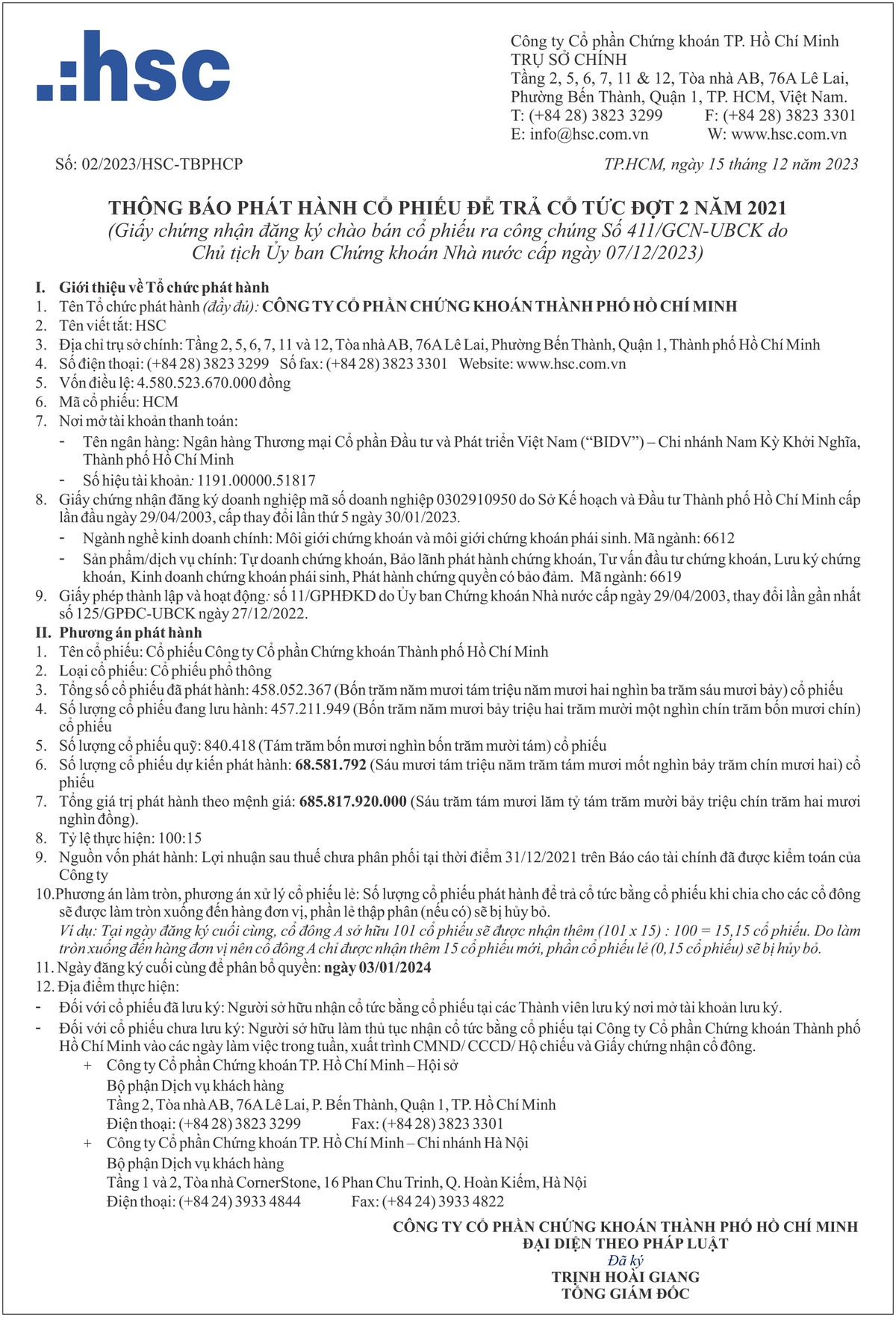 Công ty cổ phần Chứng khoán TP.HCM (HSC) thông báo chào bán cổ phiếu cho cổ đông hiện hữu 15/12/2023 18:09