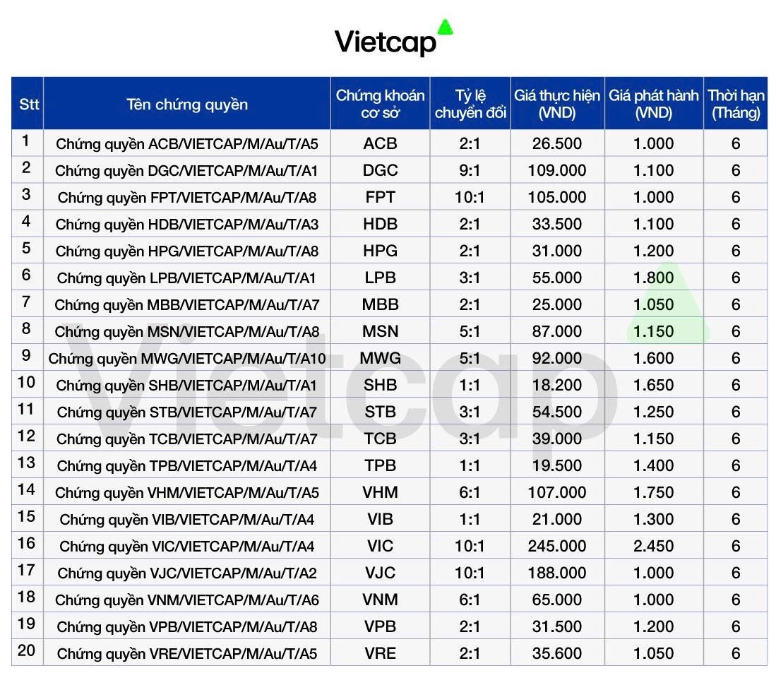 Công ty Cổ phần Chứng khoán Vietcap (VCI) thông báo về việc chào bán 20 mã Chứng quyền có bảo đảm (CW) - Đợt 1 năm 2025 (Kỳ 2)