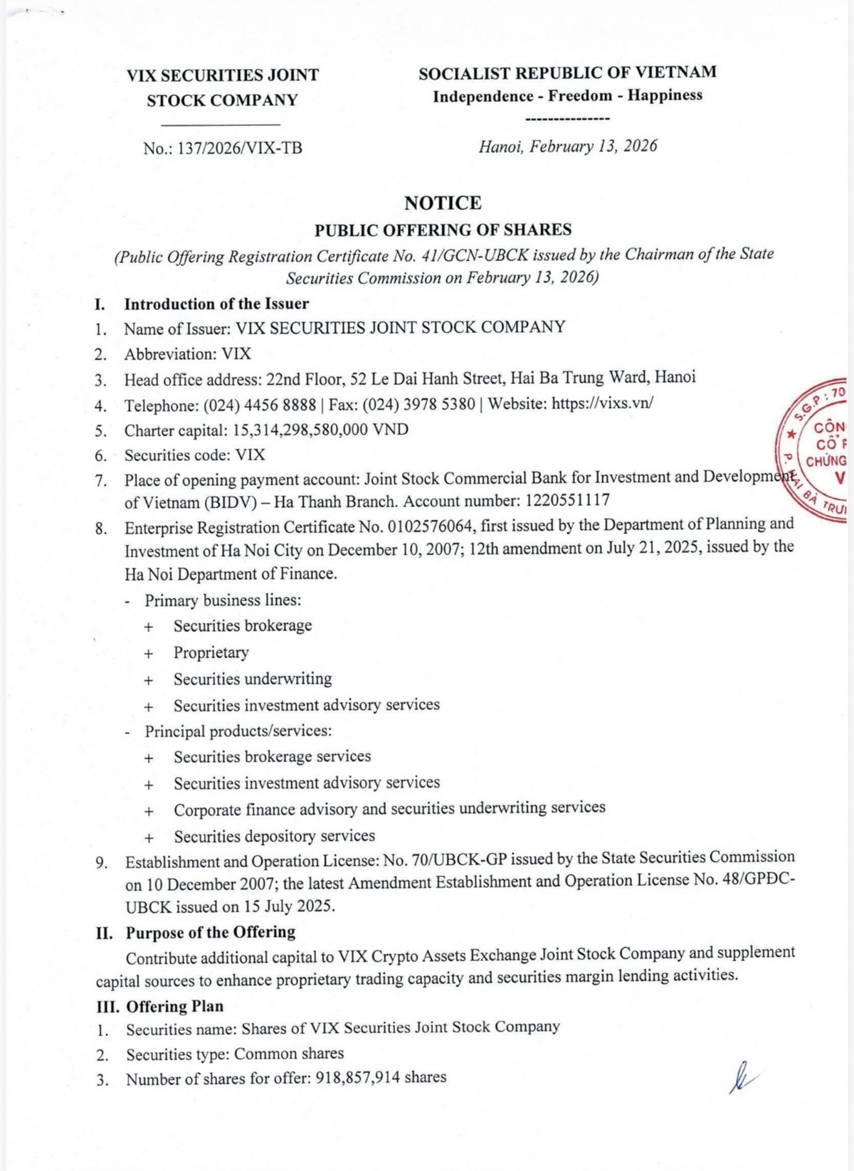 Chứng khoán VIX (VIX) muốn đầu tư 1.000 tỷ đồng vào công ty Sàn giao dịch Tài sản mã hoá VIX 17/01/2026 09:03