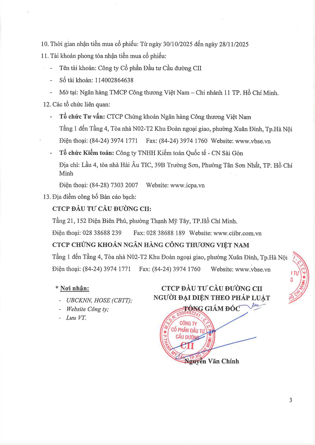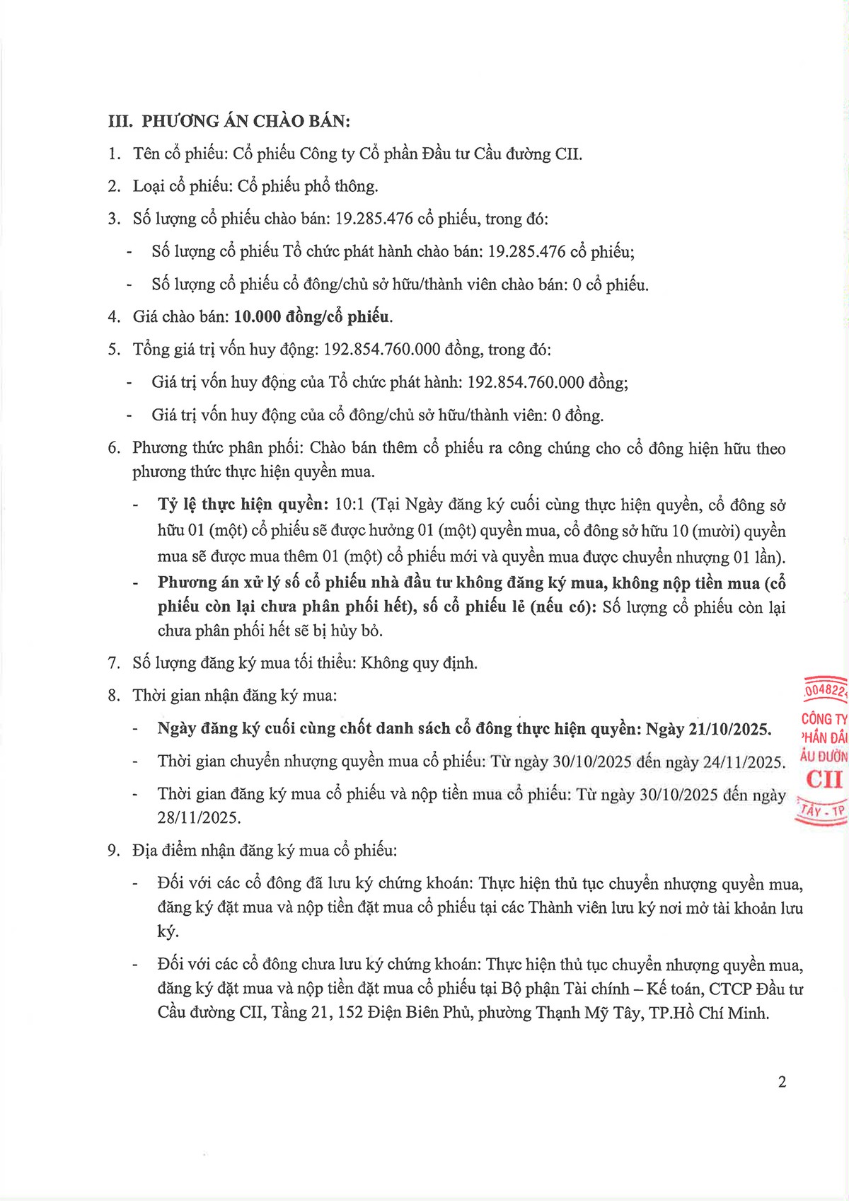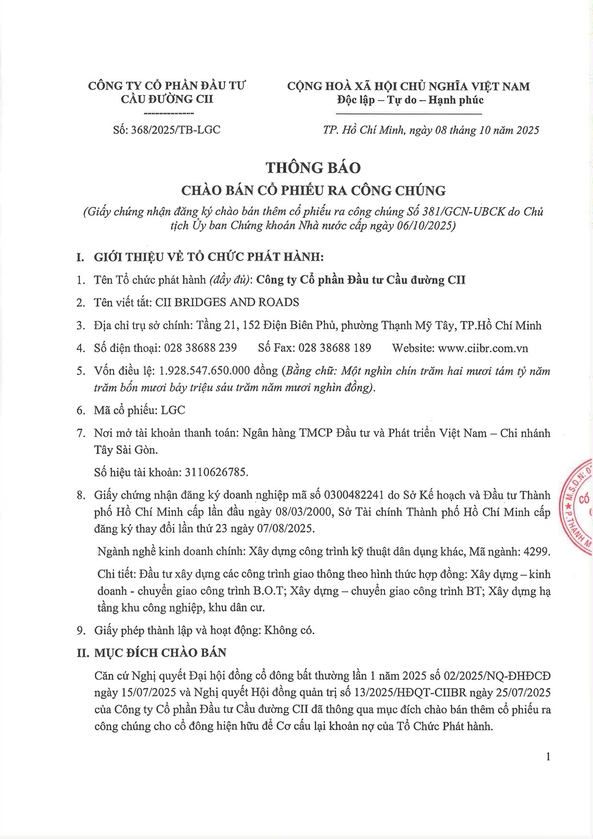 Công ty cổ phần Đầu tư Cầu đường CII (LGC) thông báo chào bán cổ phiếu ra công chúng (Kỳ 1) 08/10/2025 10:49