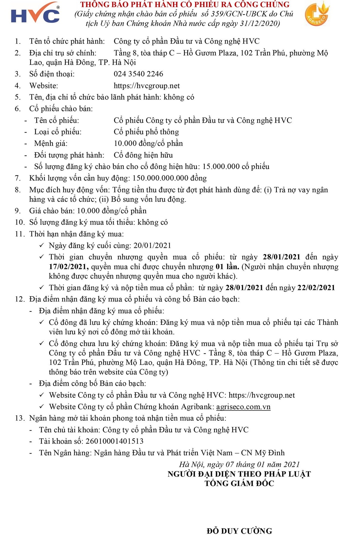 Chia sẻ Chia sẻ Tin liên quan Công ty cổ phần Thực phẩm Sao Ta thông báo phát hành cổ phiếu ra công chúng 07/01/2021 07:00 Công ty cổ phần Thành Thành Công - Biên Hòa thông báo chào bán trái phiếu ra công chúng 06/01/2021 08:00 Công ty cổ phần Tập đoàn Masan thông báo niêm yết trái phiếu trên Sở GDCK TP.HCM 06/01/2021 07:00 Công ty cổ phần Thành Thành Công - Biên Hòa thông báo chào bán trái phiếu ra công chúng 05/01/2021 08:00 Từ khóa Công ty cổ phần Đầu tư và Công nghệ HVC