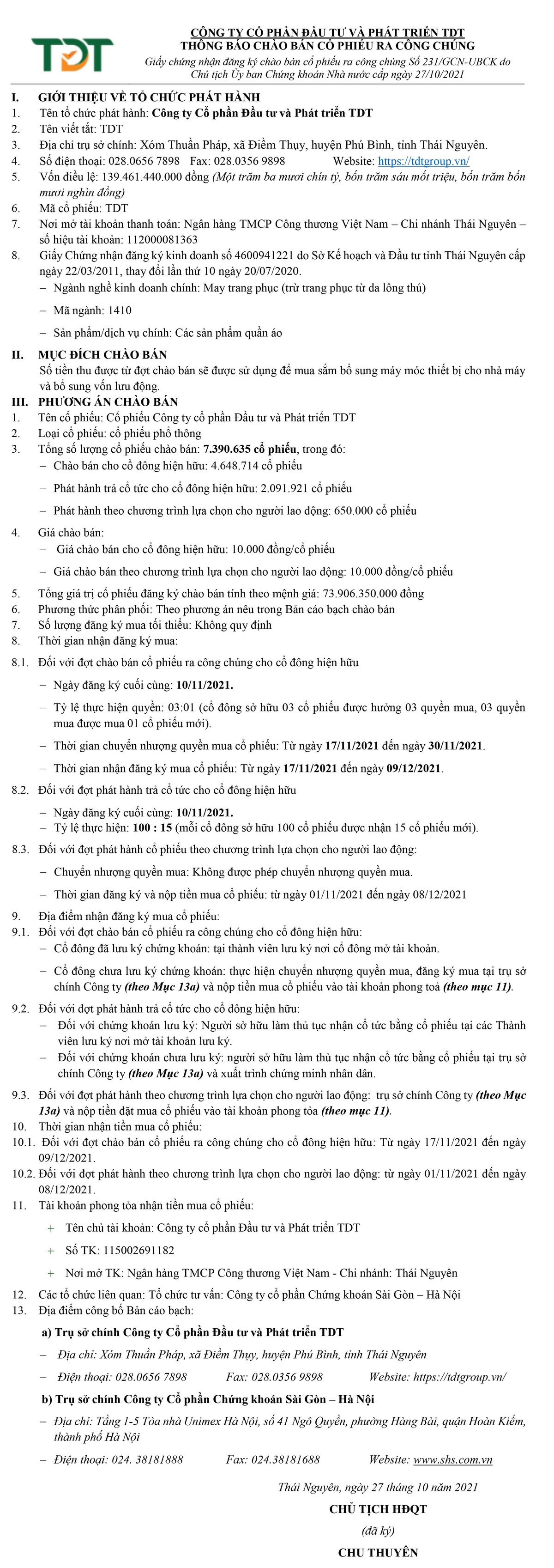 Công ty cổ phần Đầu tư và Phát triển TDT thông báo chào bán cổ phiếu ra công chúng