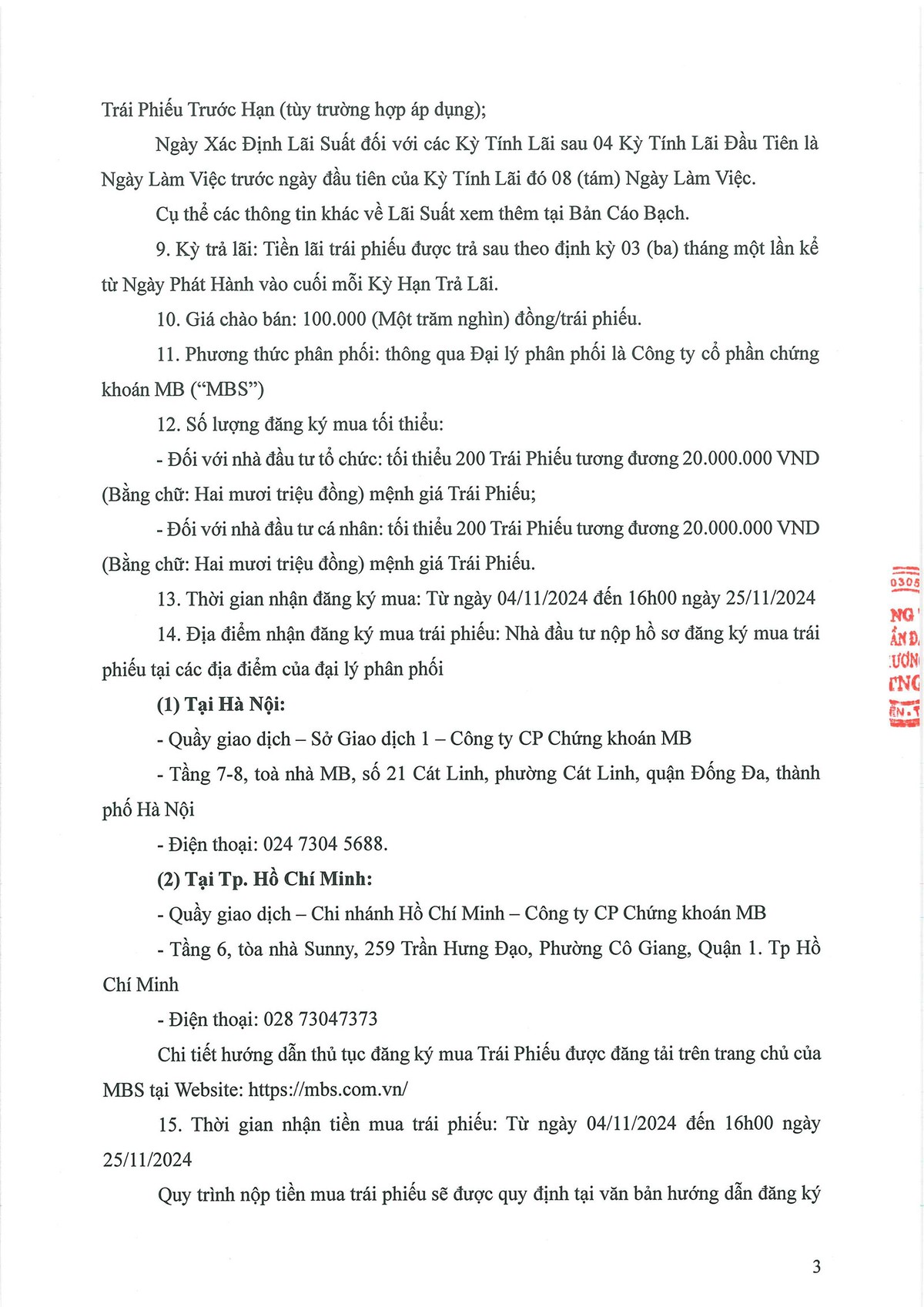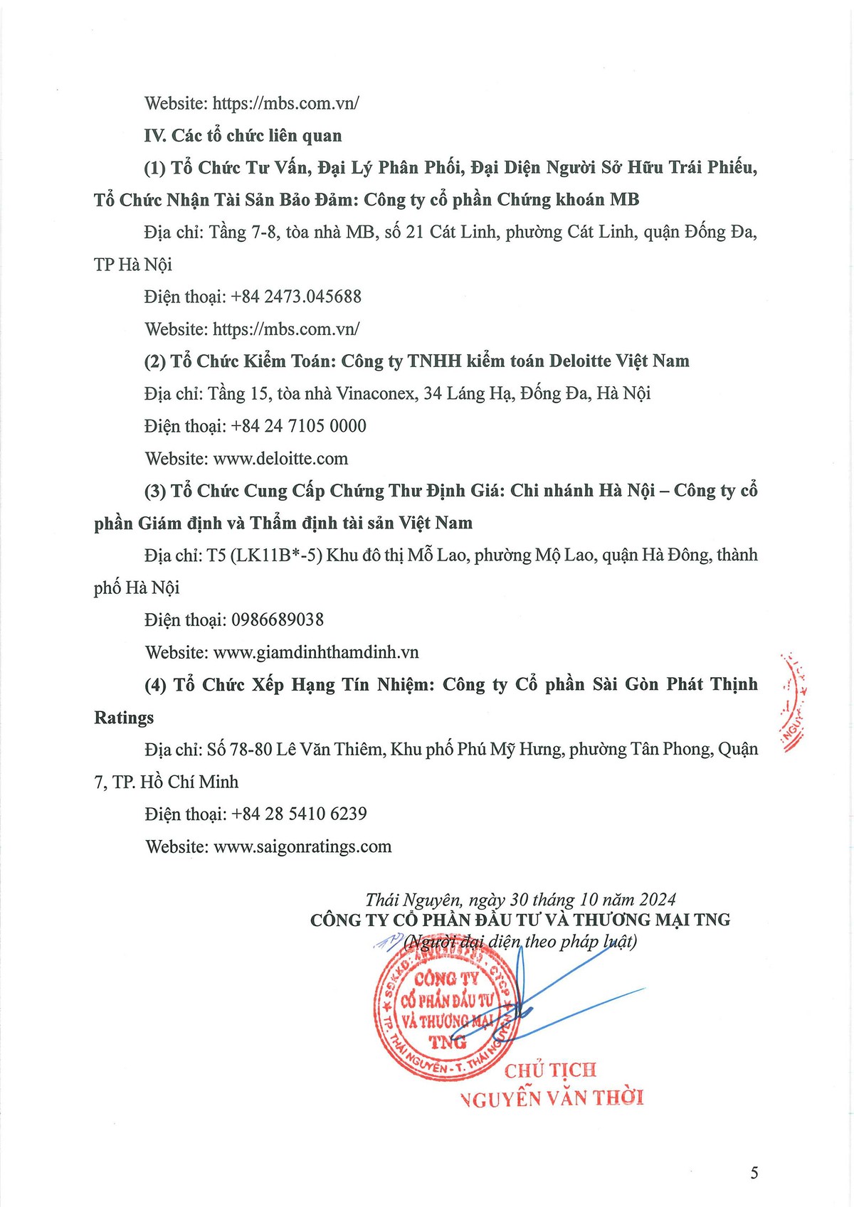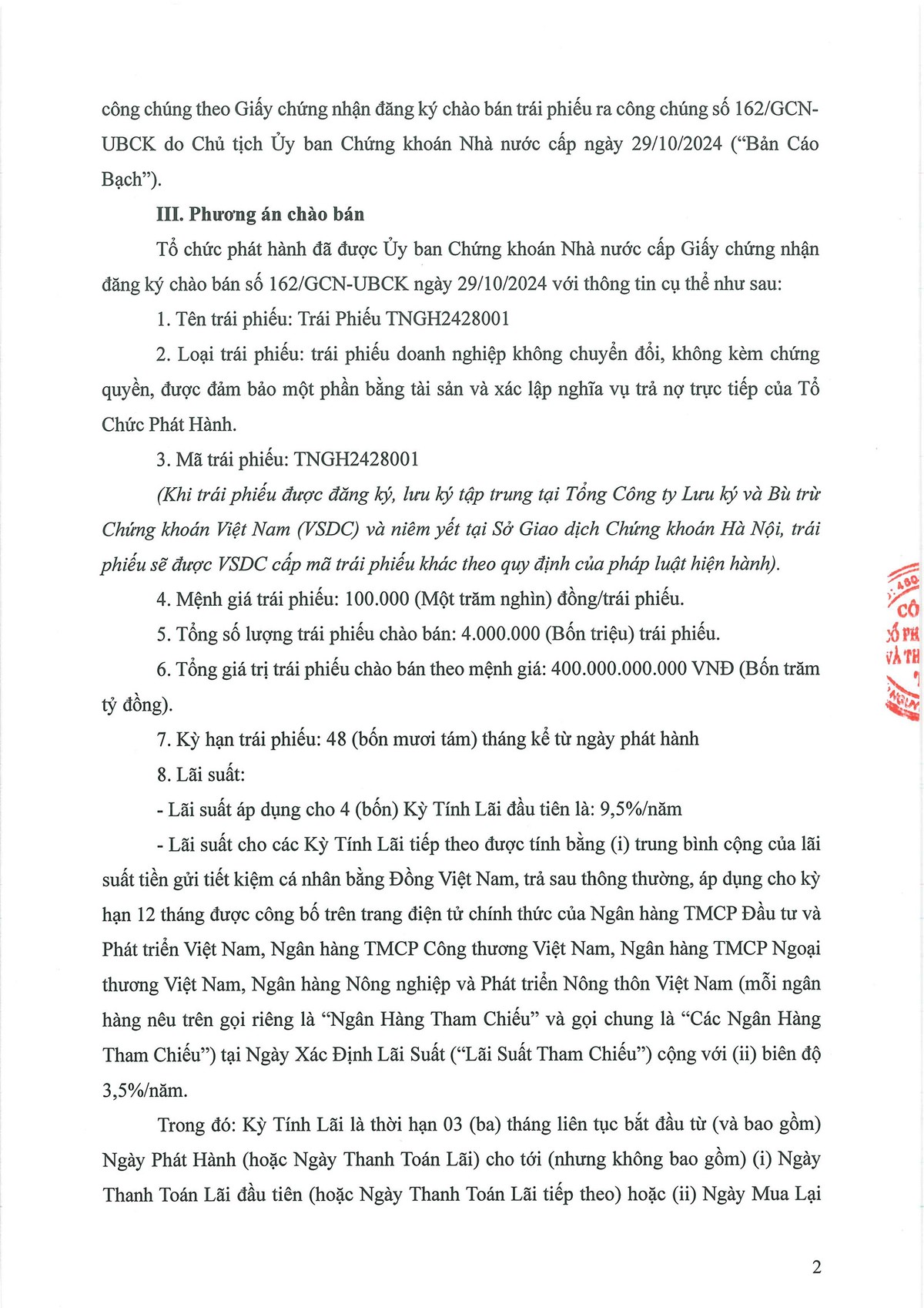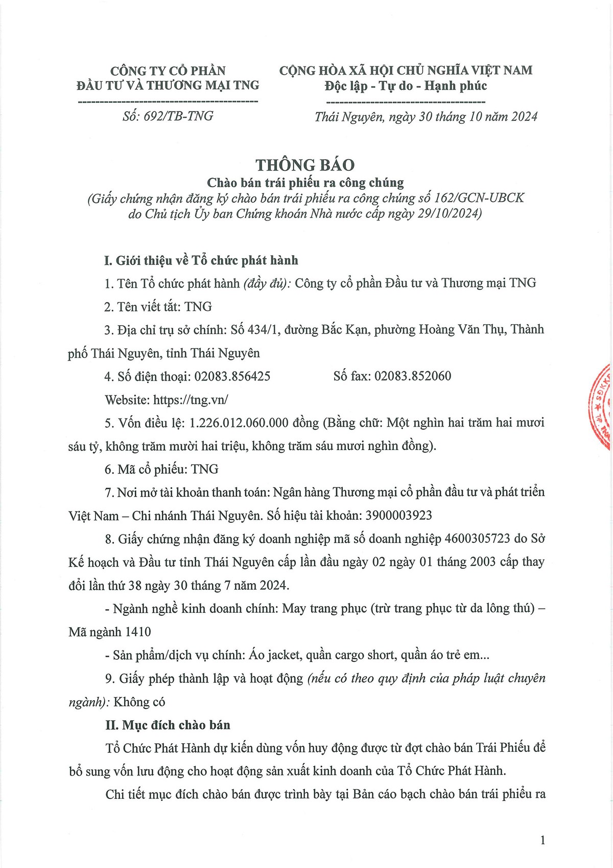 Công ty cổ phần Đầu tư và Thương mại TNG thông báo chào bán trái phiếu ra công chúng 31/10/2024 07:00