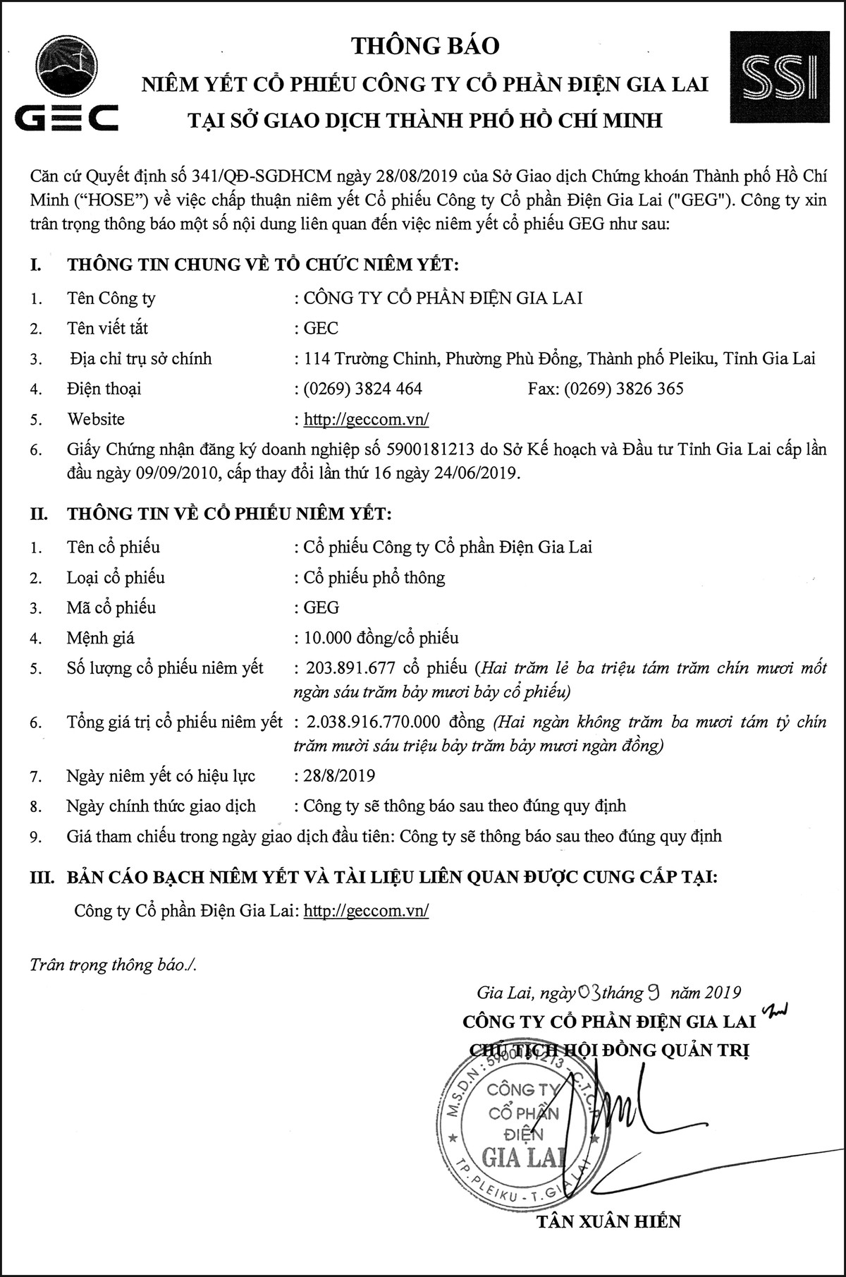 Công ty cổ phần Điện Gia Lai (GEC) thông báo niêm yết cổ phiếu tại Sở GDCK TP.HCM