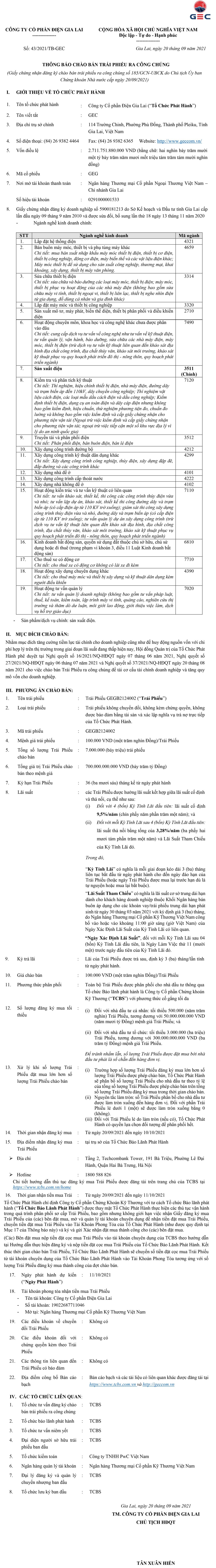 Tin liên quan Công ty cổ phần Điện Gia Lai (GEC) thông báo niêm yết cổ phiếu tại Sở GDCK TP.HCM 04/09/2019 07:30 Công ty cổ phần Masan Meatlife thông báo chào bán trái phiếu ra công chúng 08/08/2021 07:00 Tổng công ty Phát triển đô thị Kinh Bắc - CTCP (KBC) thông báo chào bán trái phiếu ra công chúng 04/06/2021 07:01 Từ khóa Công ty cổ phần Điện Gia Lai