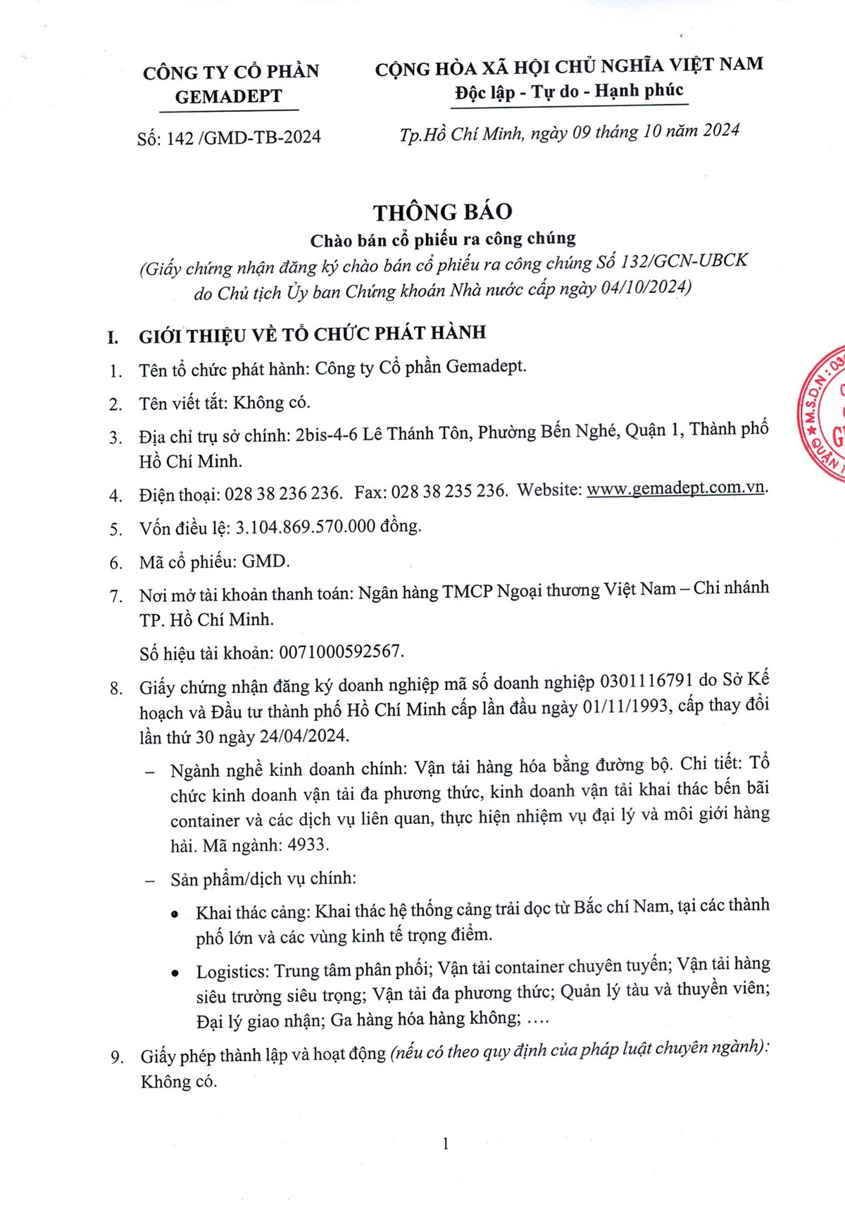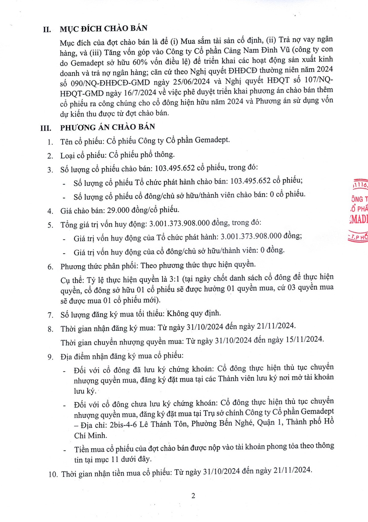 Tin liên quan Công ty cổ phần Gemadept (GMD) thông báo chào bán cổ phiếu ra công chúng 12/10/2024 07:00 Công ty cổ phần Gemadept (GMD) thông báo chào bán cổ phiếu ra công chúng 11/10/2024 07:00 Gemadept (GMD) sắp chào bán gần 103,5 triệu cổ phiếu với giá 29.000 đồng/CP 17/07/2024 06:42 Từ khóa Gemadept GMD Gemadept chào bán cổ phiếu GMD chào bán cổ phiếu